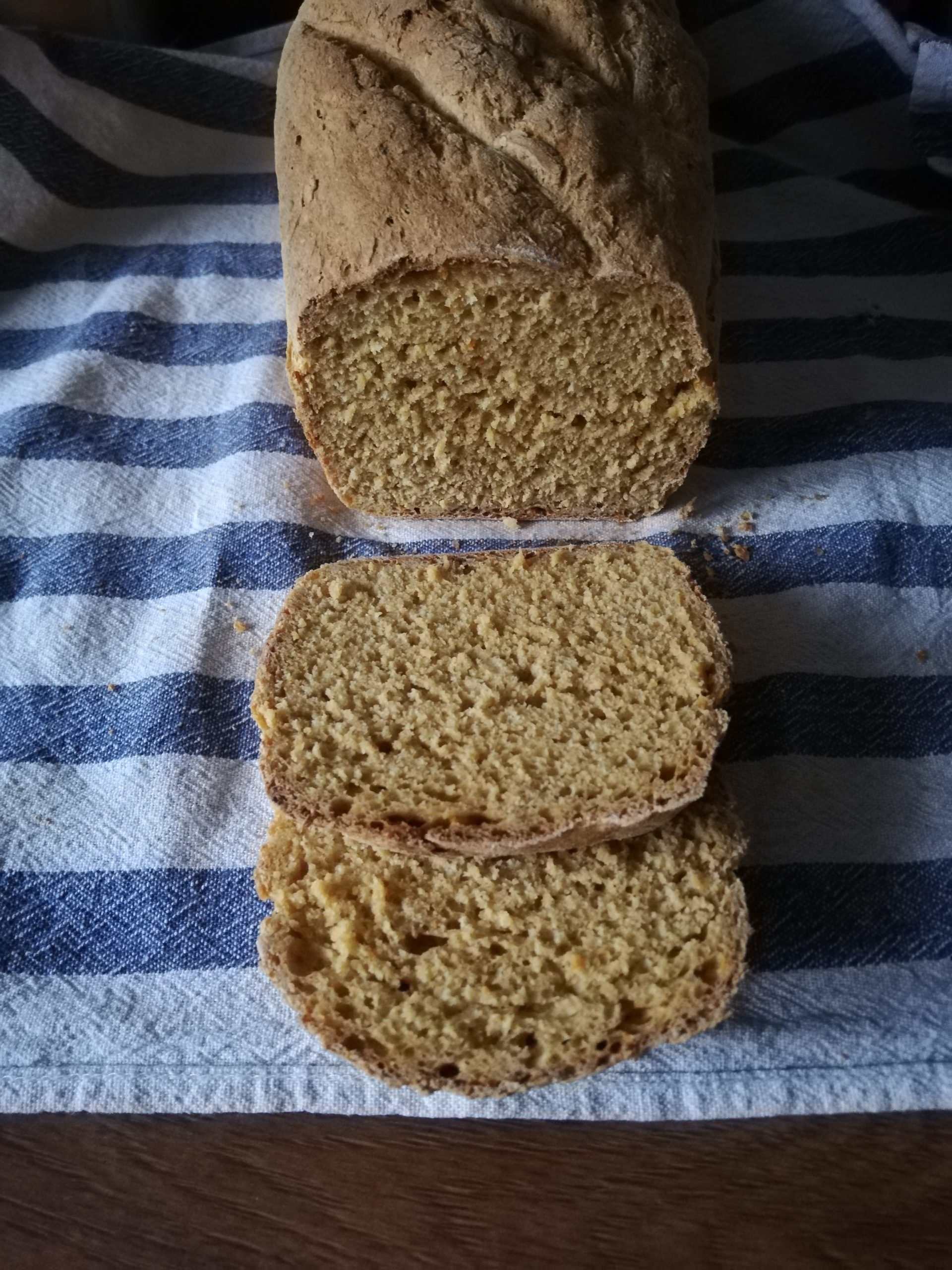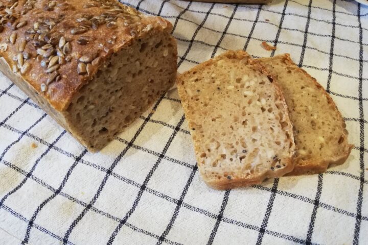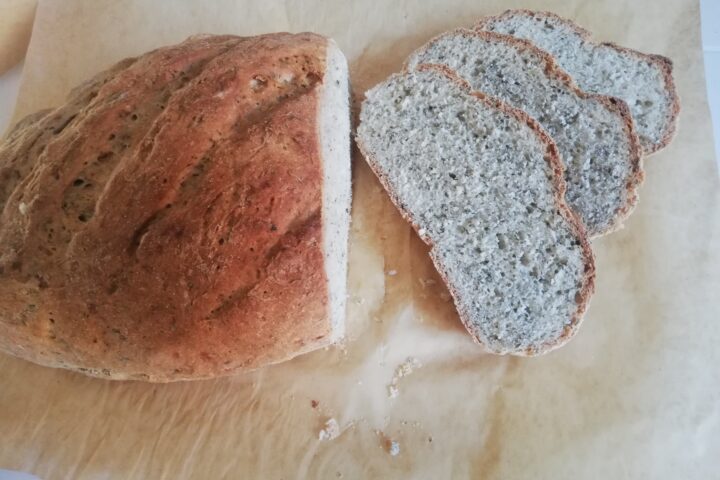 - Ciasto jest elastyczne, formujemy chlebek okrągły lub podłużny, przykrywamy ściereczką. Gdy chleb urośnie, nacinamy wierzch chleba ostrym nożem, wkładamy do piekarnika, pieczemy 40 minut w temperaturze 200 C.