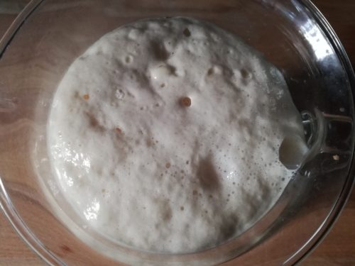 - Robimy zaczyn: W dużym kubku, wlewamy 1,5 szklanki ciepłej przegotowanej wody (nie gorącej!) dodajemy pokruszone drożdże, cukier , 3 łyżki mąki, mieszamy i odstawiamy na 10-15 min, zacznie się pienić i urośnie.