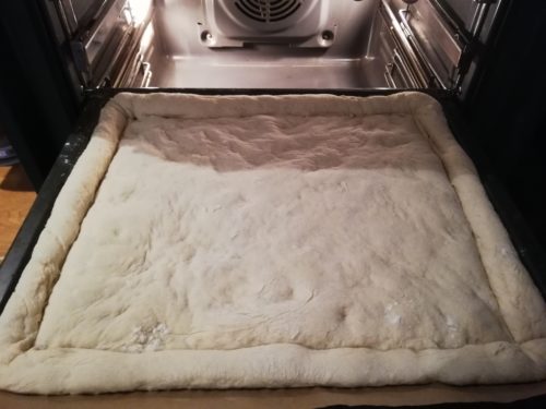 - Na wyrośnięte ciasto rozsmarowujemy 2 łyżki oliwy.