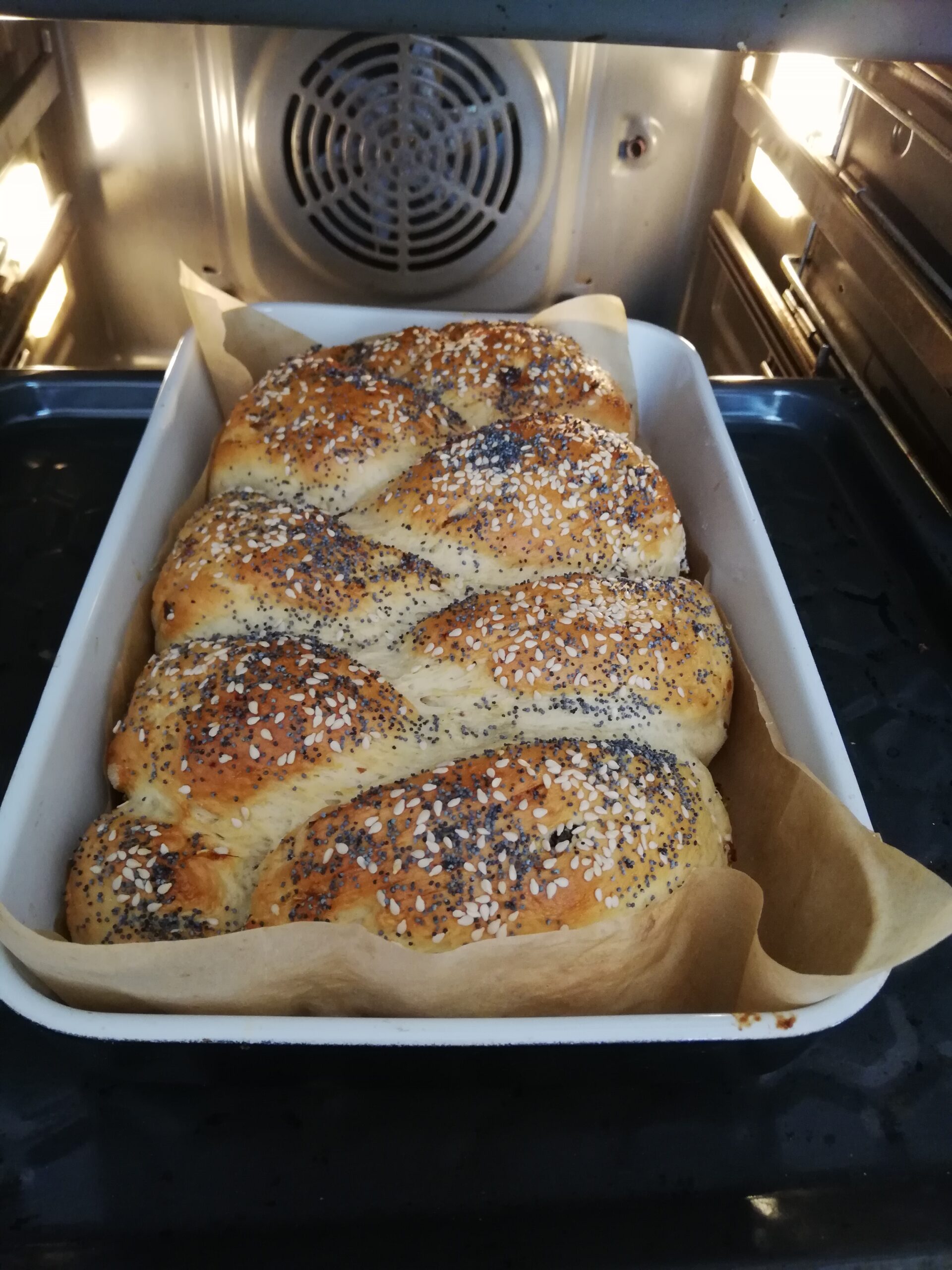 • Pozostawiamy do wyrośnięcia. Gdy podwoi swoją objętość, smarujemy jajkiem lub mlekiem posypujemy makiem, sezamem, kruszonką, cynamonem, cukrem lub pozostawiamy czystą, jak kto woli.