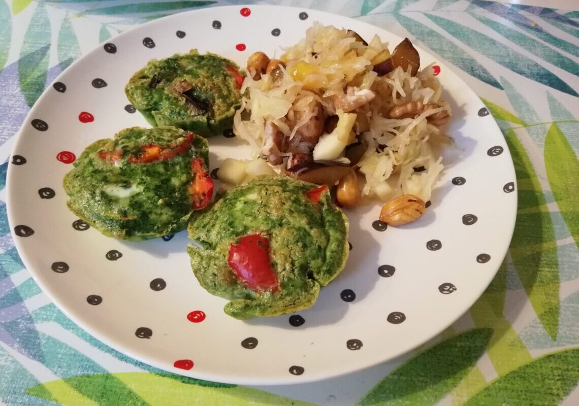Idealnie do babeczek szpinakowych pasuje sałatka z kiszonej kapusty z owocami i orzechami…Wypróbuj koniecznie 🙂