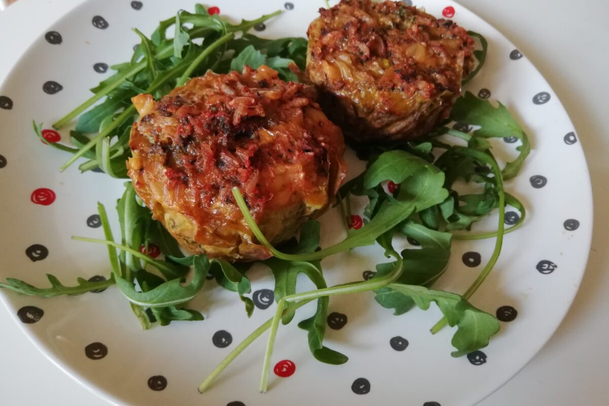 Świetny pomysł na wykorzystanie pozostałych resztek ryżu lub resztek z warzyw. Najczęściej robię babeczki, kiedy w lodówce mam pozostały ryż z obiadu, a po wyciśniętym soku z marchewki i buraka zostało mnóstwo pulpy, której po prostu szkoda wyrzucić. Babeczki smakują na ciepło, jak i na zimno, jako samodzielne danie podane z sosem pomidorowym lub jako dodatek do dania drugiego. Sprawdzają się również świetnie na wycieczki i biwaki 🙂