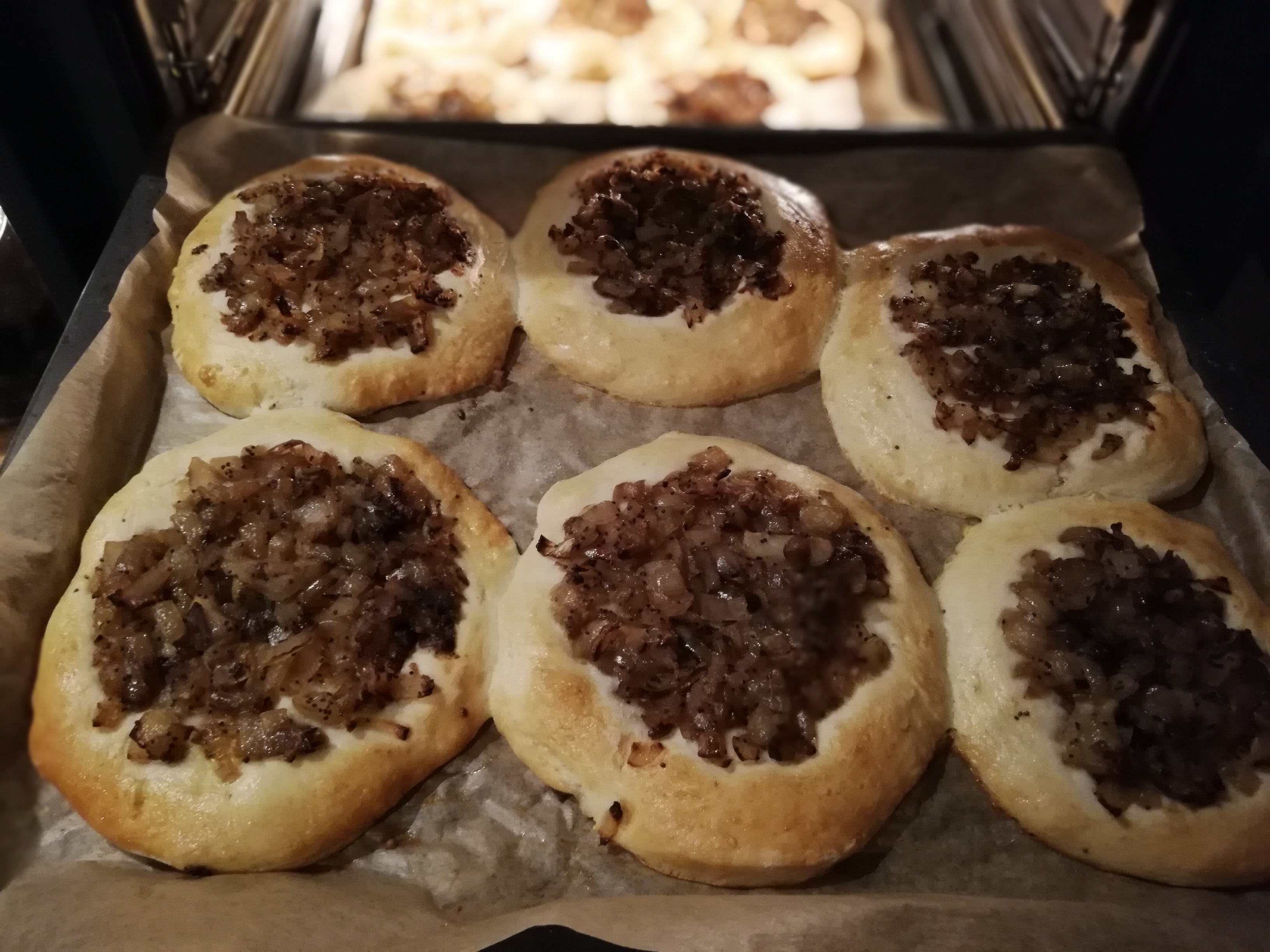 - Gdy placki na cebularze są już wyrośnięte, nakładamy na środek farsz cebulowy, brzegi smarujemy rozmąconym jajkiem. Pieczemy około 25 min w 185 C.