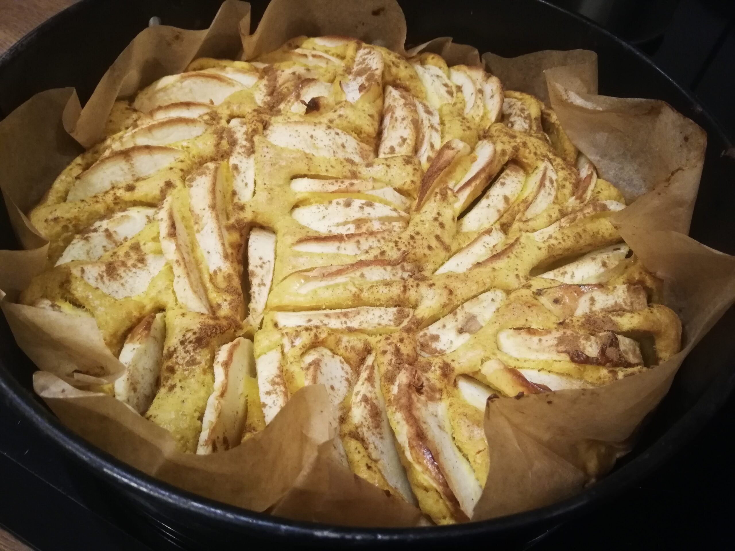 • Jabłka obieramy, kroimy w grubsze plastry układamy na cieście, delikatnie dociskając do ciasta, całość oprószamy cynamonem.