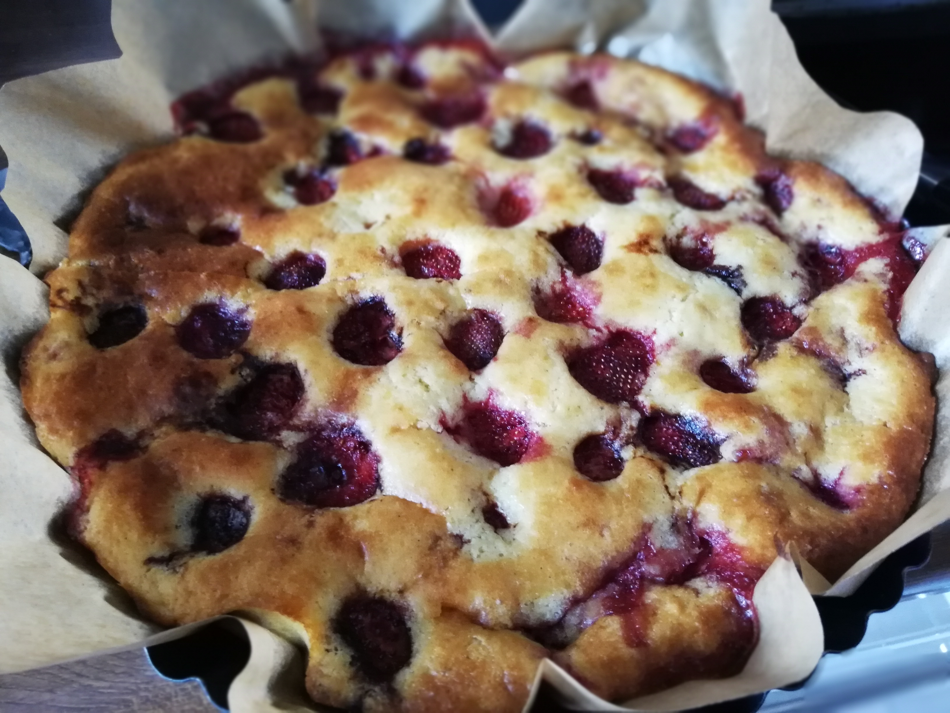 - Ciasto wylać do foremki, powciskać w ciasto truskawki. Piec 40 minut w 180 C.