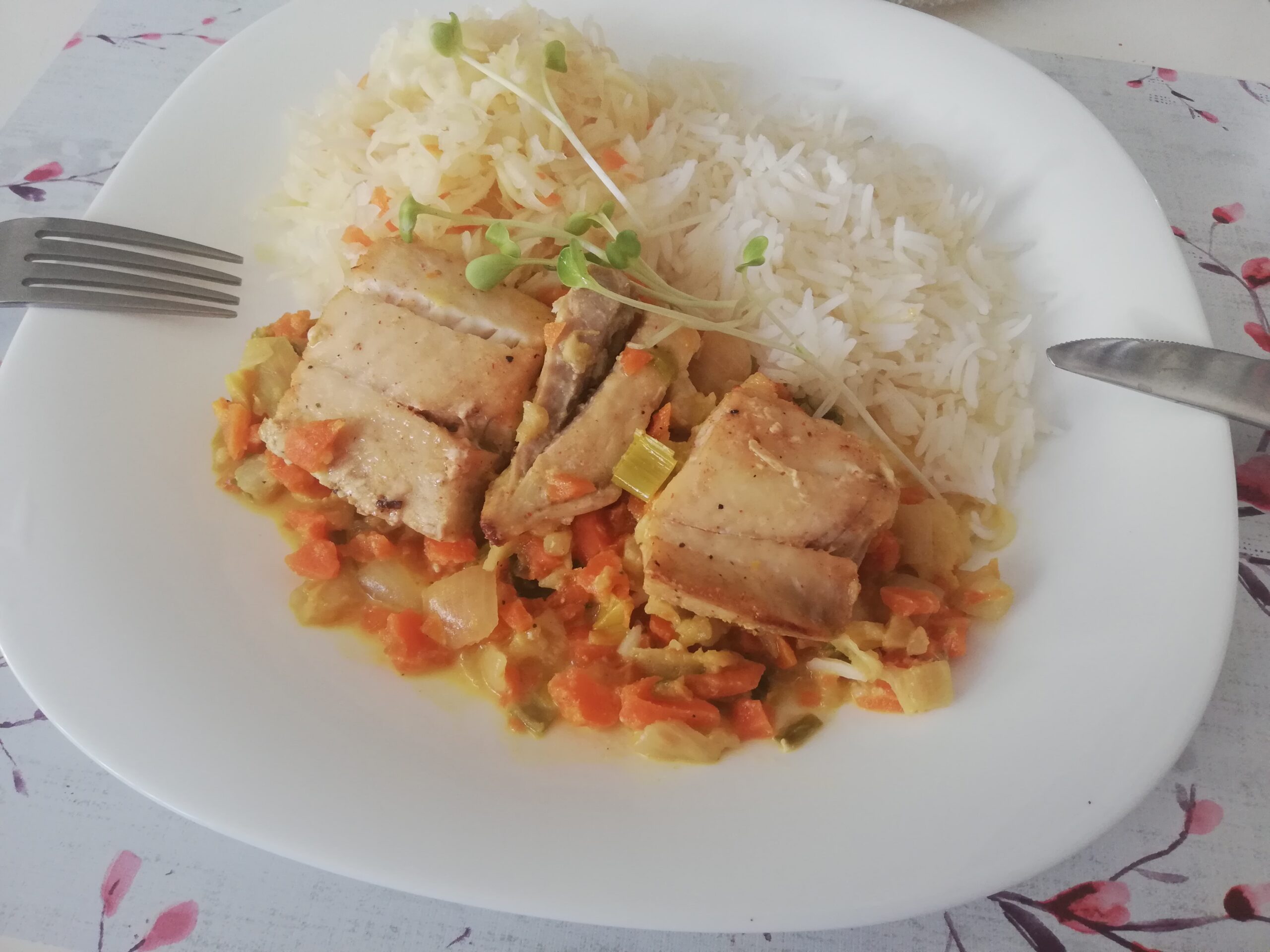 • Gdy Dorsz jest gotowy, wykładamy na talerz w towarzystwie duszonych warzyw i ryżu.