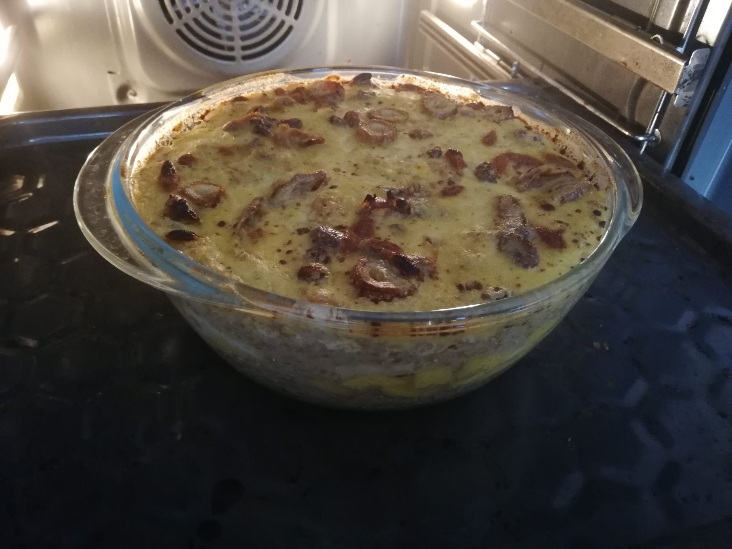 • Na głęboką blachę, wyłożoną papierem do pieczenia, wykładamy warzywa, polewamy sosem jajecznym, wierzch posypujemy mozzarellą.