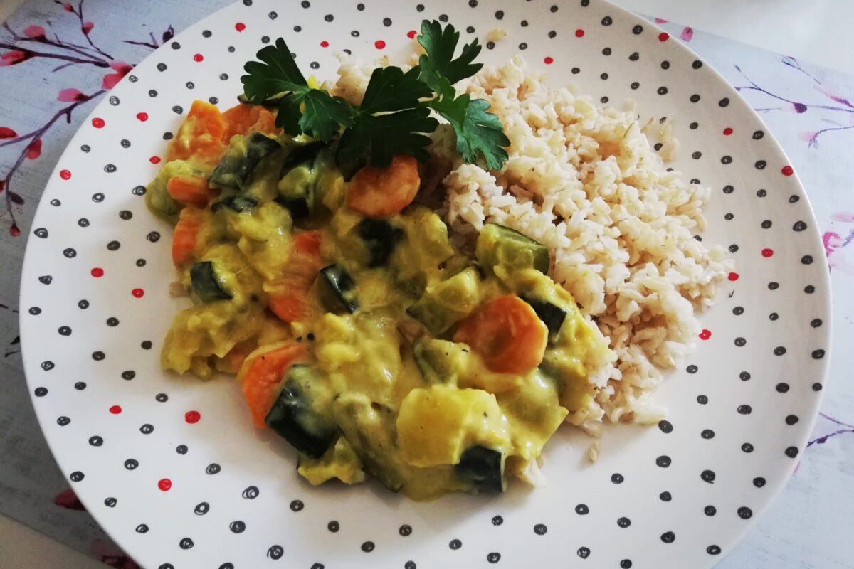Pyszny gulasz z warzyw w słodkim sosie carry z orzechów nerkowca.