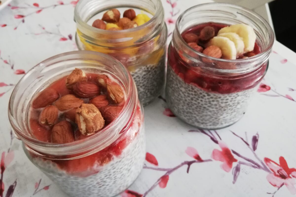 Lekki deser, przekąska, śniadanie… idealne na szkoły, pracy lub na wycieczkę 🙂 Zdrowy jogurt na bazie mleka roślinnego z wartościowymi nasionami chia…Z dodatkiem świeżych owoców, orzechów, nasion…Pyszny i odżywczy…Zawsze pod ręką w lodówce, kiedy mam ochotę na coś szybkiego i pysznego 🙂