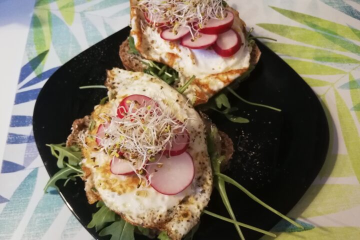 Chlebek świeży lub wcześniej zapieczony w piekarniku (rozkładamy kromki na blaszce i zrumieniamy), polewamy oliwą z oliwek, kładziemy mozzarelle i pomidora, posypujemy cebulką, kiełkami, solą i pieprzem, opcjonalnie można dodać oliwki. 😋