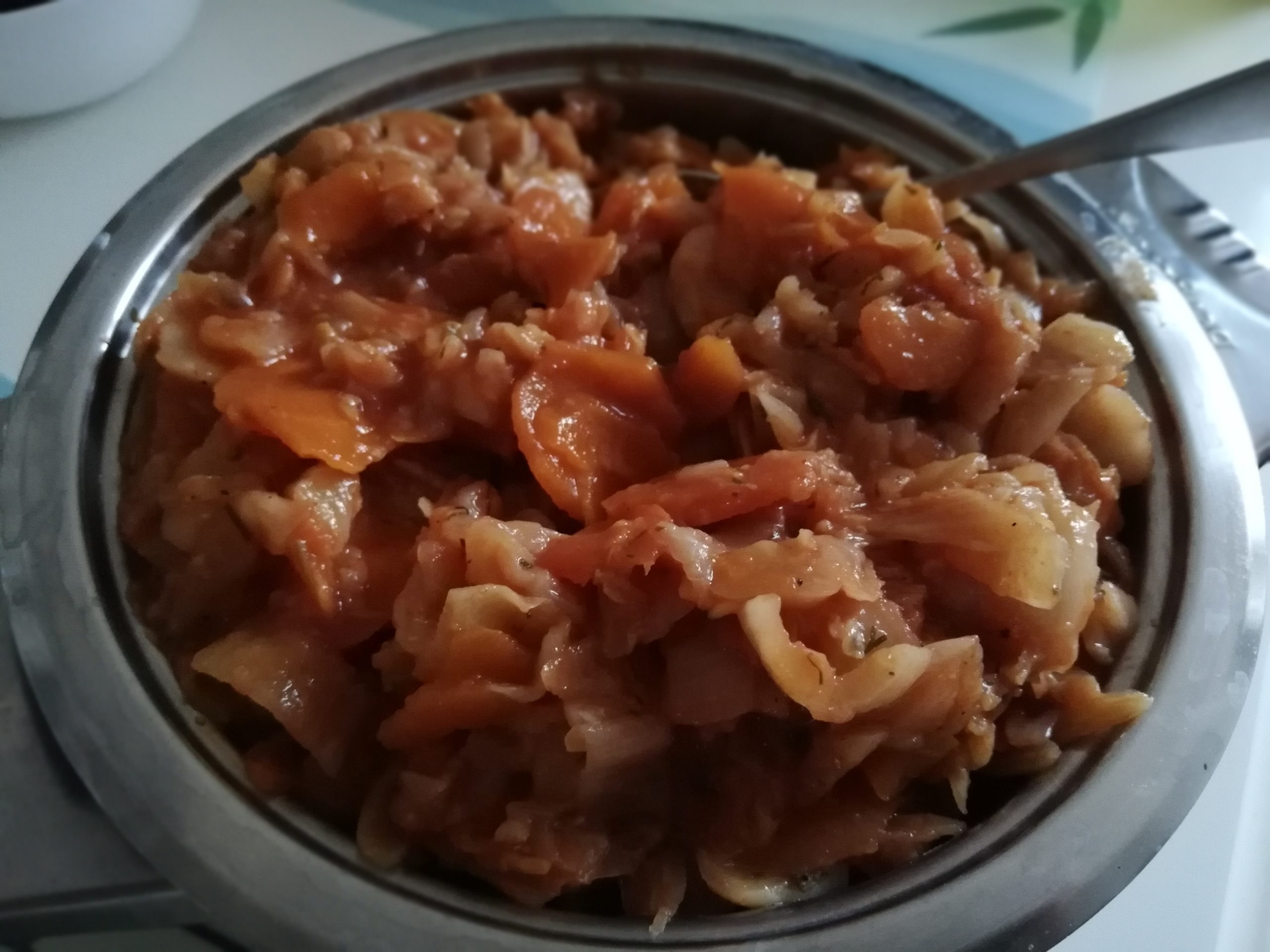 • Kapustę i warzywa szatkujemy, dodajemy wszystkie przyprawy, wrzucamy do garnka, dusimy razem, cały czas mieszając, około 5 minut (jeśli kapusta jest zbyt sucha, podlewamy delikatnie wodą), następnie wlewamy przecier pomidorowy, koperek i dusimy wszystko razem około 30 min, dosmaczamy solą i pieprzem.