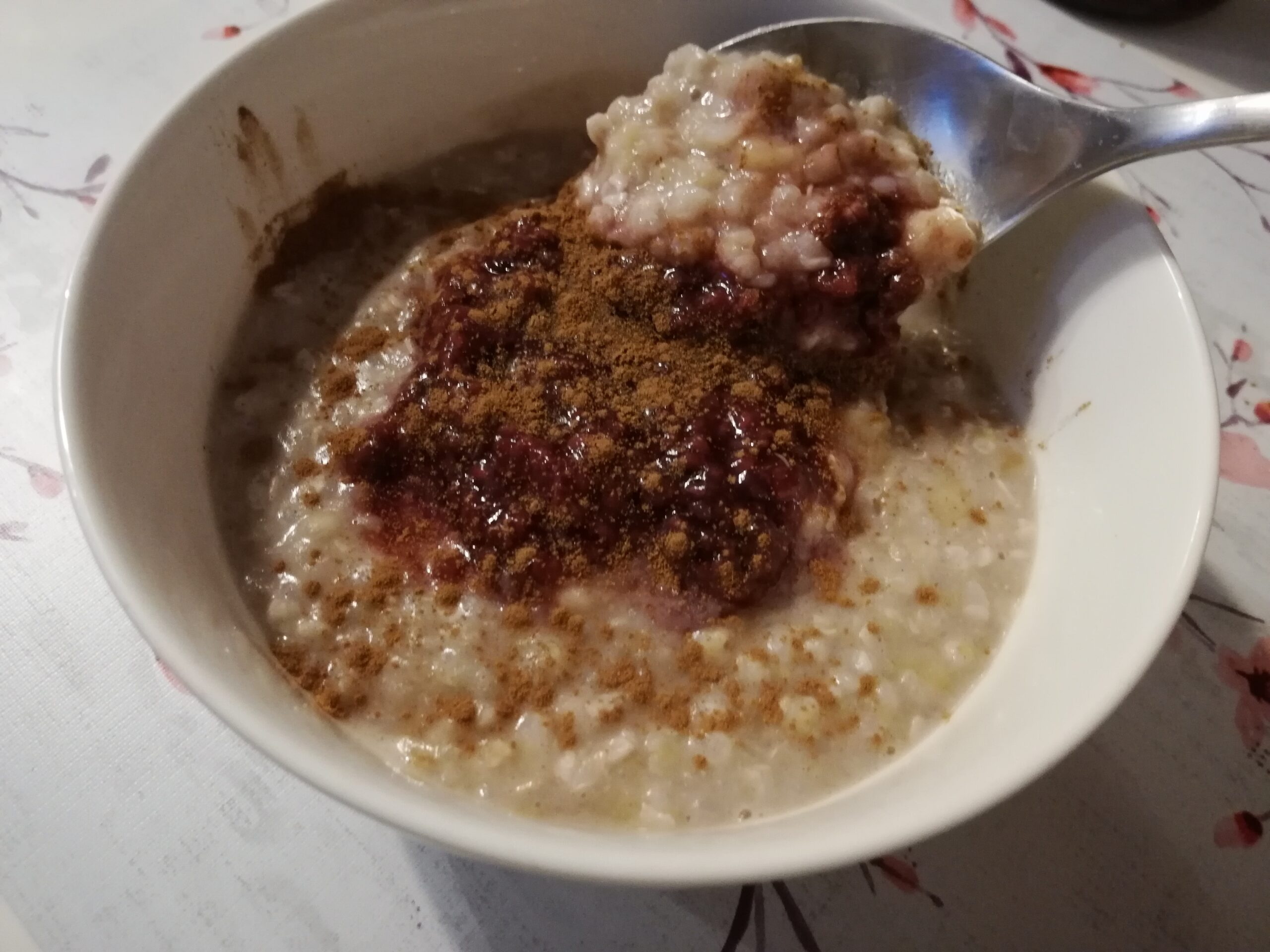 - Kaszę wykładamy do miseczki, dodajemy maliny, oprószamy cynamonem.
