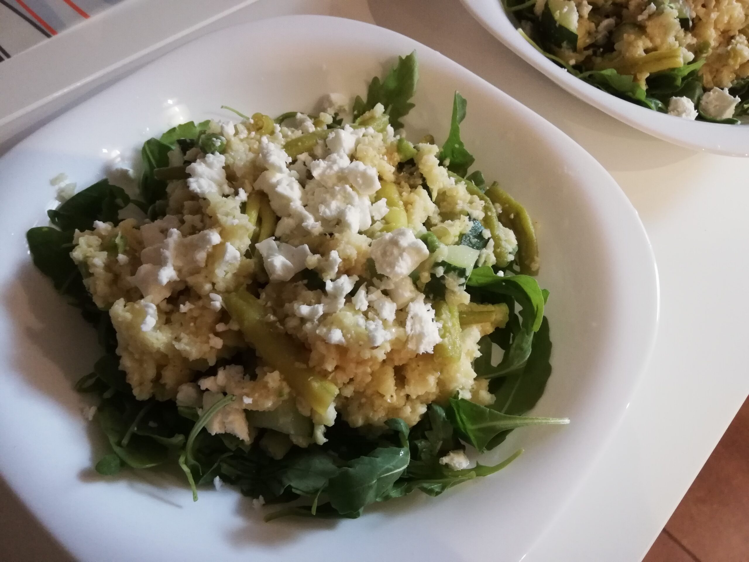 Szybki obiad lub kolacja …Wartościowa kasza jaglana na zielono z rukolą , cukinią, fasolką i groszkiem …Pycha!