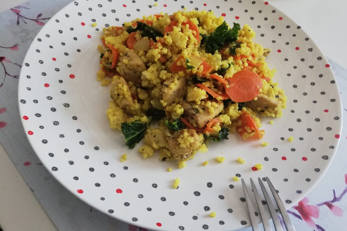 Obiad z kaszy jaglanej z piersią kurczaka i jarmużem, szybki w przygotowaniu, syty, wartościowy posiłek dla całej rodziny. Taki posiłek możemy zabrać ze sobą do pracy albo na wycieczkę 🙂