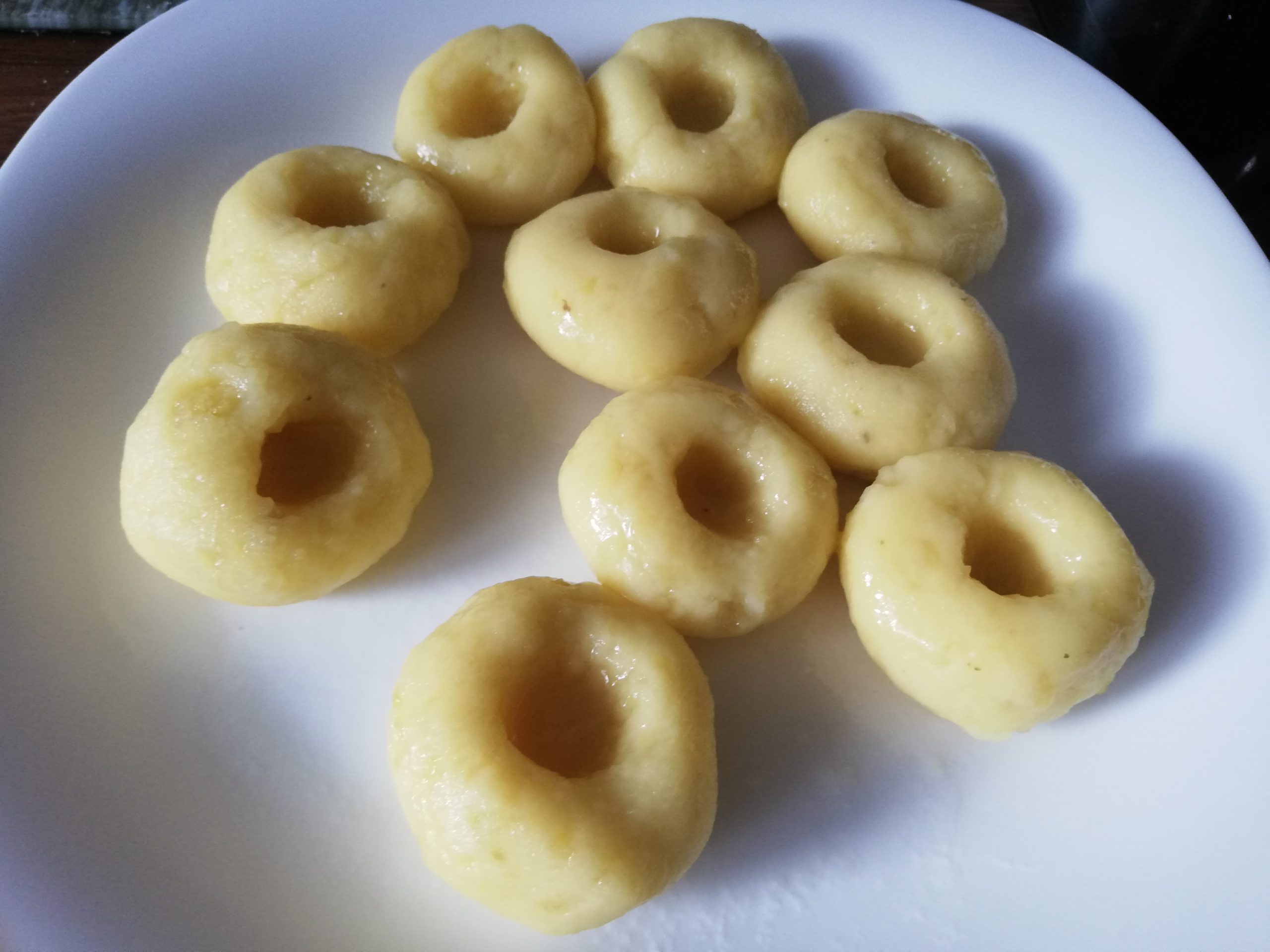 - Z ciasta robimy kulki i odciskamy palcem dziurkę. Gotowe kluski wkładamy do wrzącej wody, gotujemy do momentu wypłynięcia na powierzchnię.