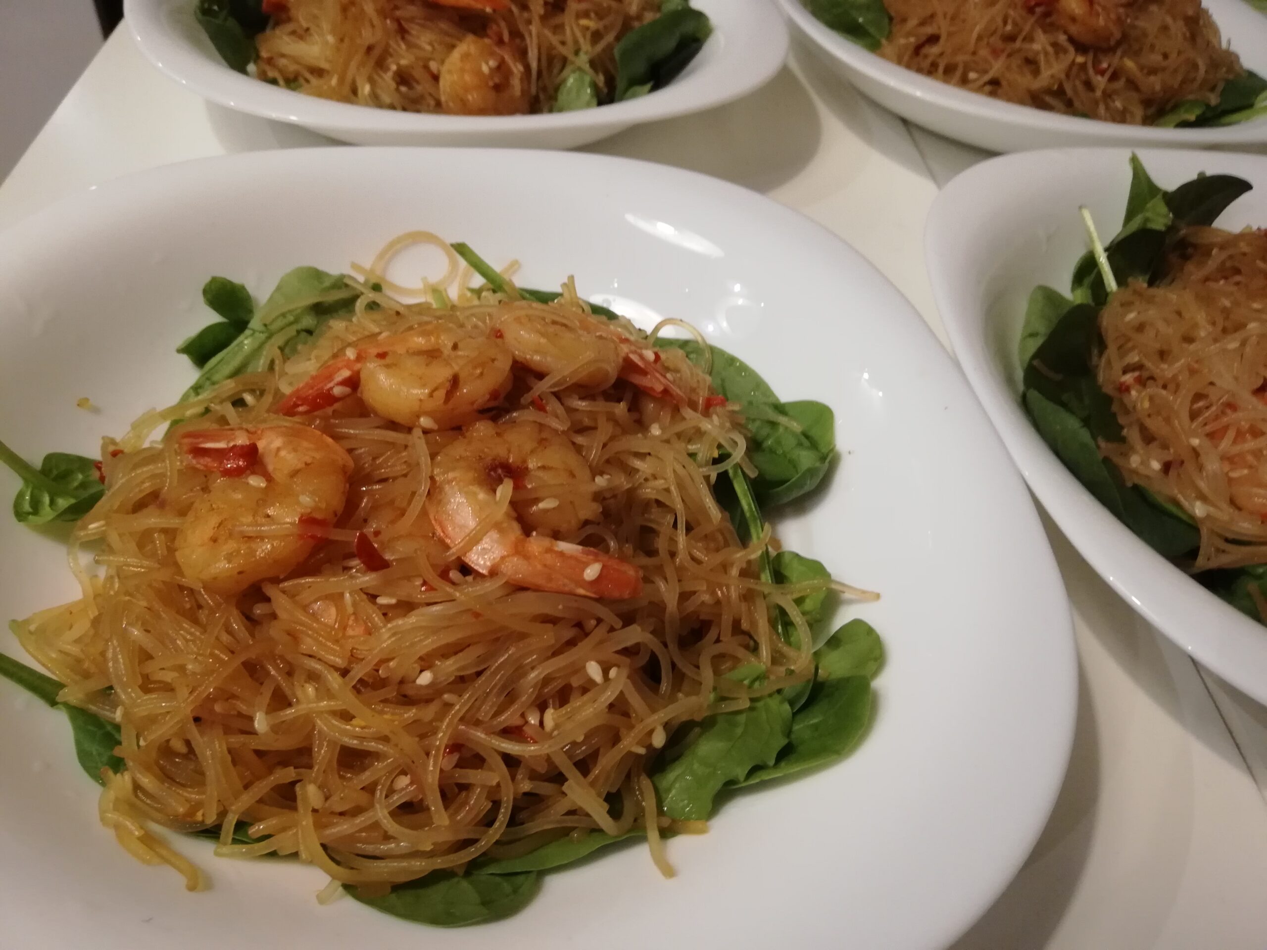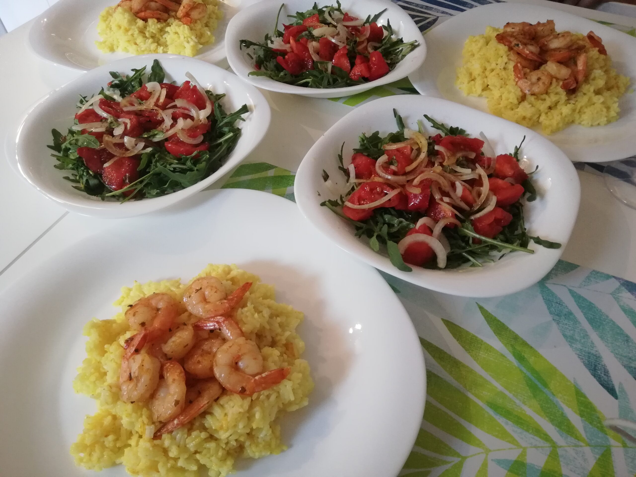 • Rozkładamy na talerze ryż, na wierzch układamy krewetki.