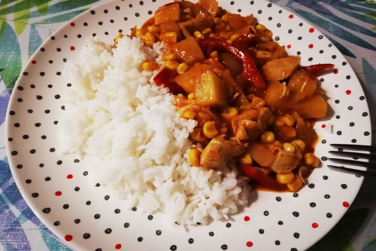 - Kurczaka w sosie słodko-kwaśnym podajemy z ryżem.
