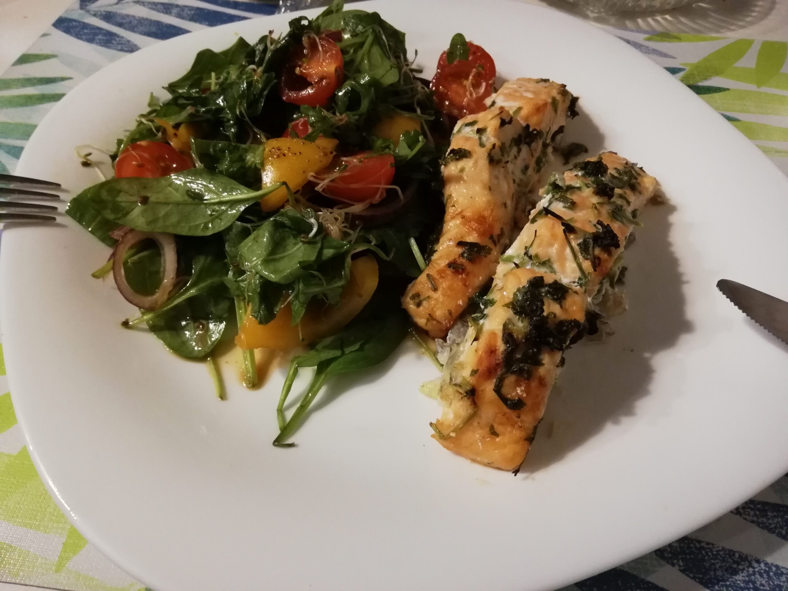 Łosoś w towarzystwie sałatki z rukoli, szpinaku, czerwonej cebuli, pomidorków koktajlowych, kiełków lucerny, papryki.