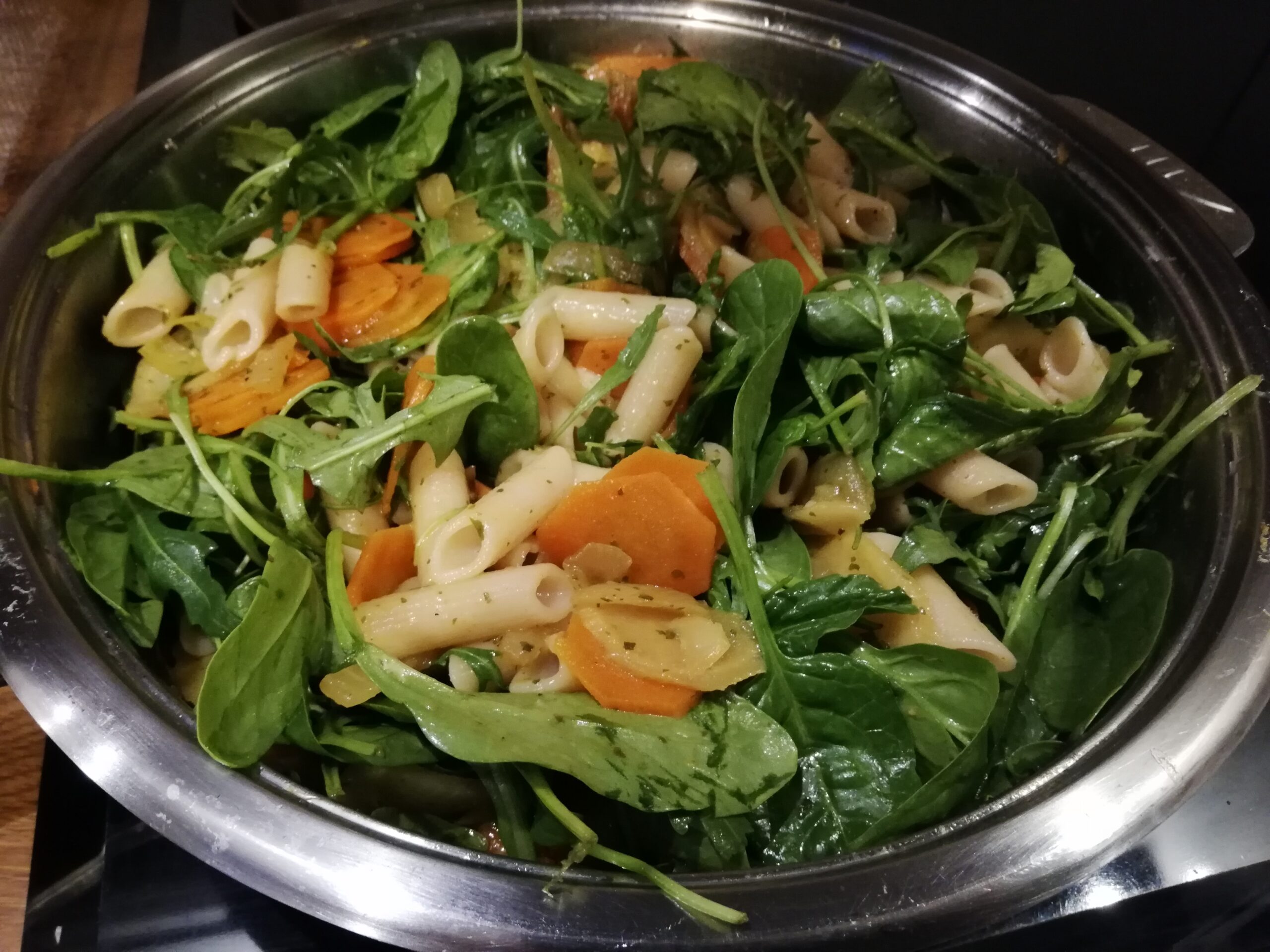 - Gdy warzywa są miękkie, dodajemy ugotowany wcześniej makaron, mieszamy, dodajemy rukolę i szpinak.