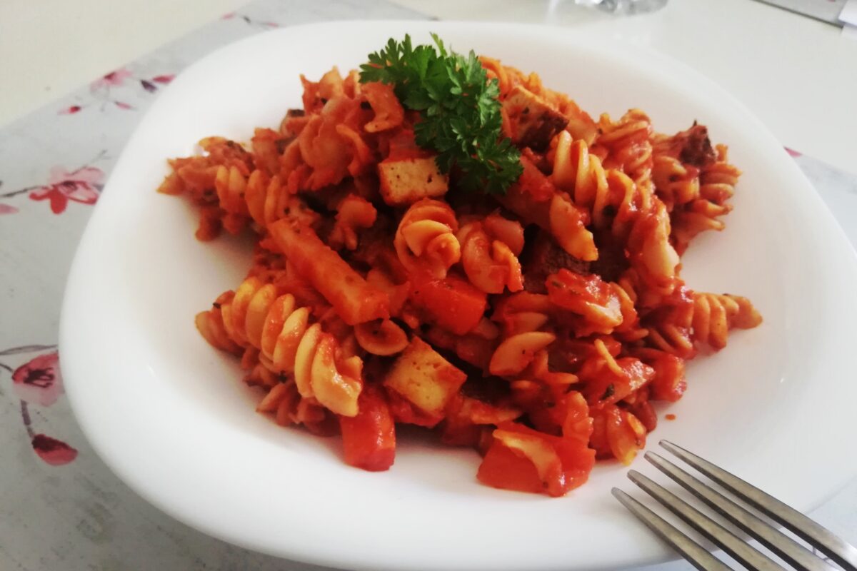 Makaron z soczewicy z sosem pomidorowym i tofu