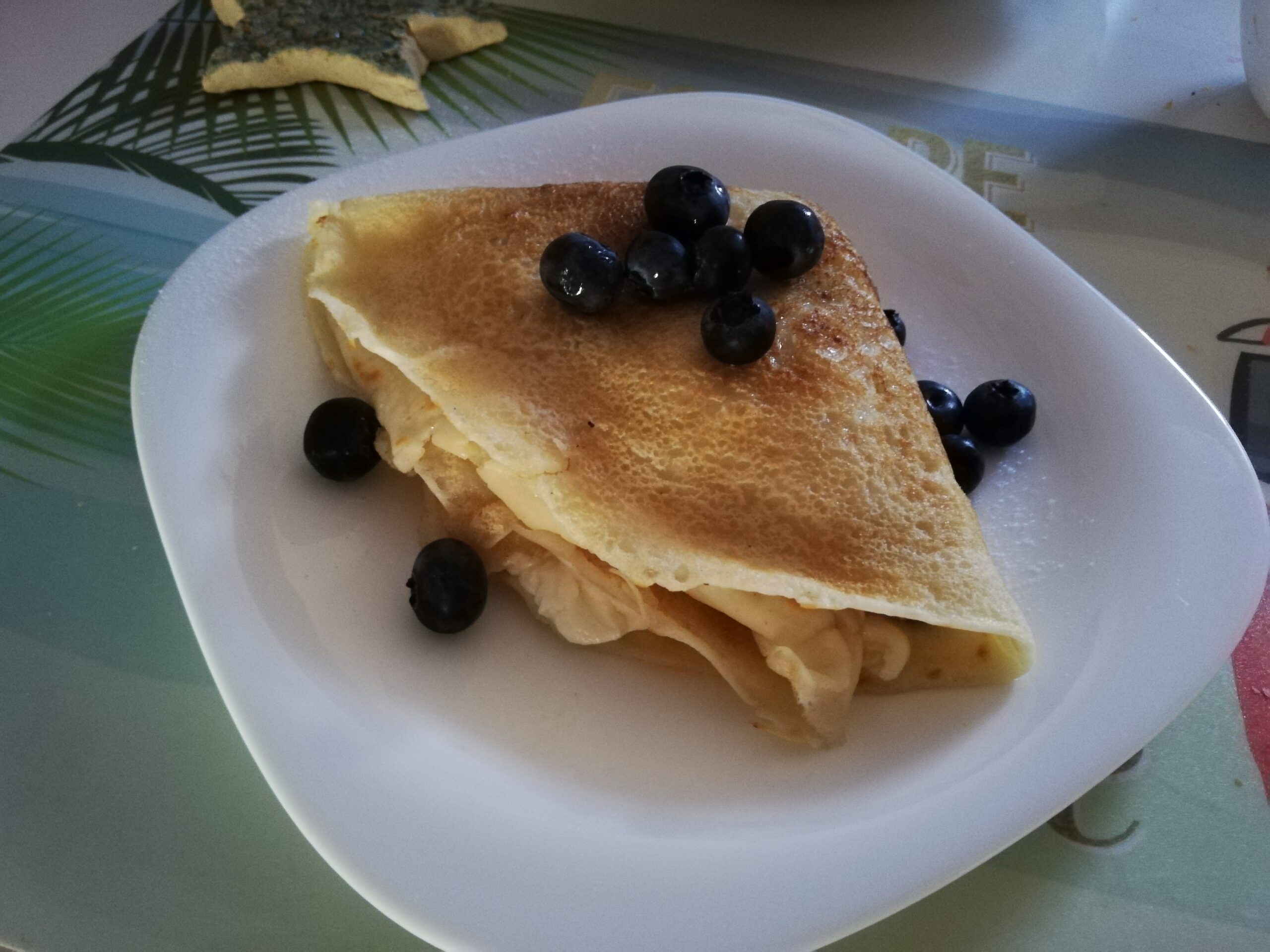 • Na naleśnika nakładamy serek, jabłka, składamy kopertę, oprószamy cynamonem , ewentualnie zmielonym ksylitolem, możemy dodać świeże owoce np borówki.