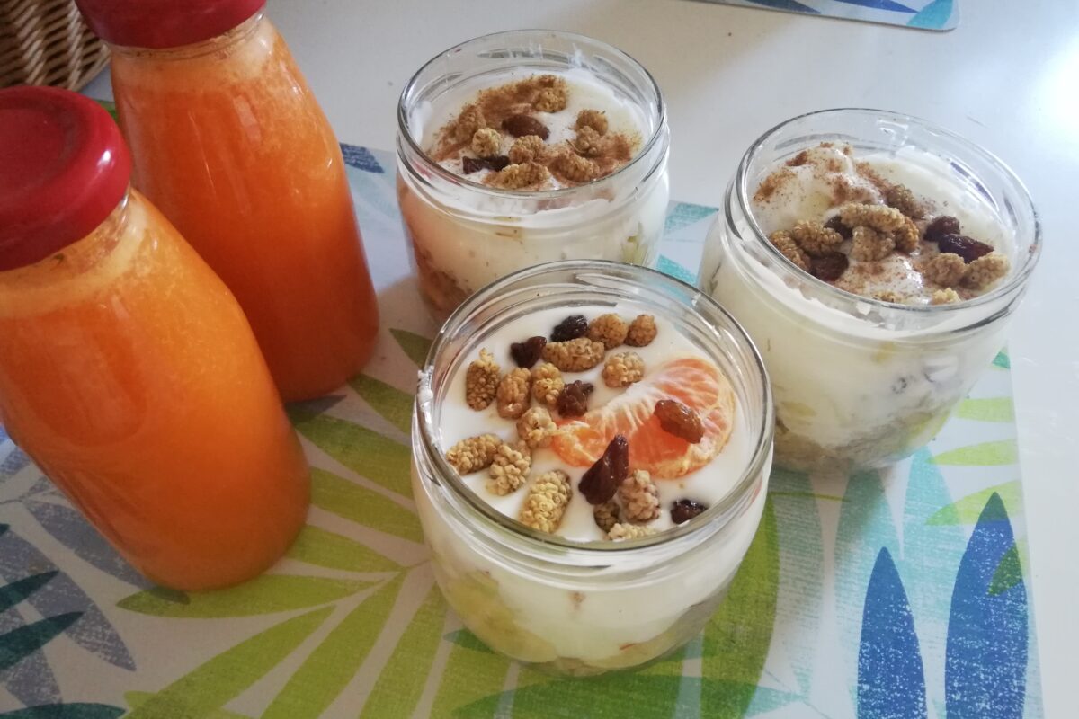 • Do małych słoiczków wkładamy na spód kilka wybranych świeżych owoców, następnie wkładamy płatki owsiane, posypujemy suszonymi owocami, zalewamy jogurtem lub kefirem, na wierzch posypujemy orzechami, cynamonem i kardamonem.