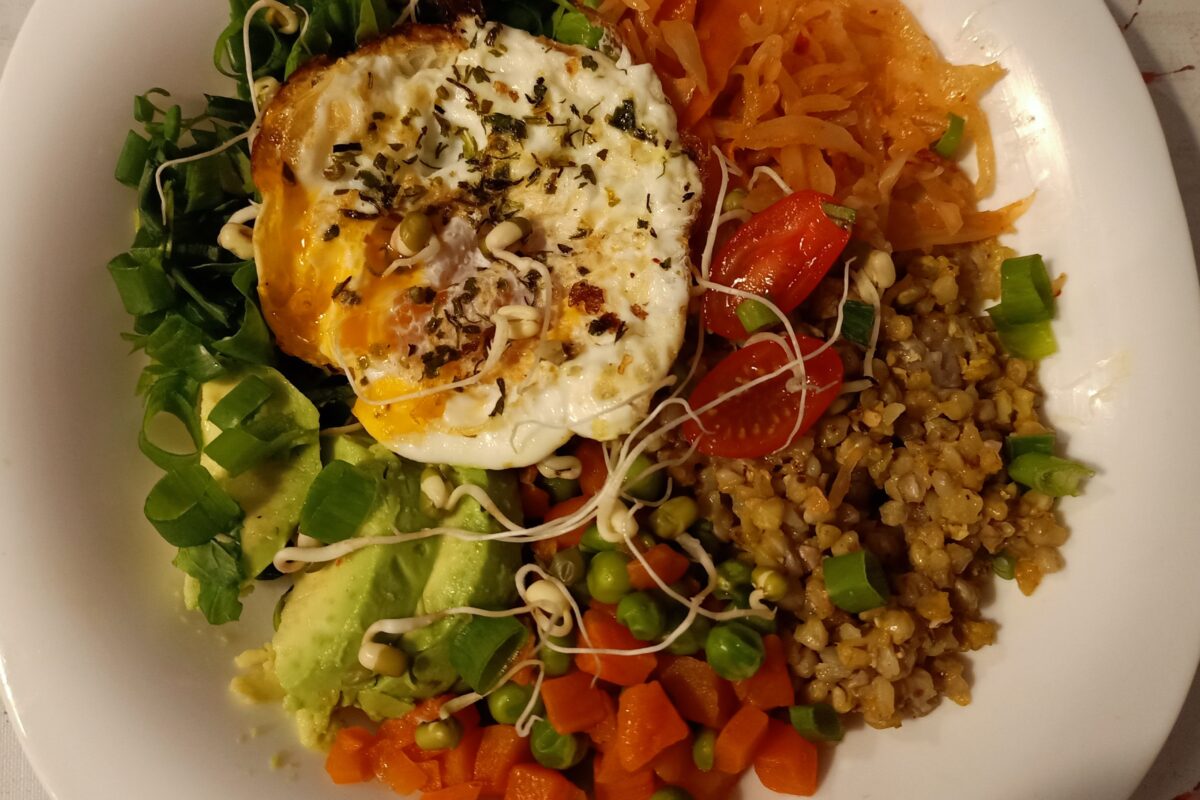 Kasza gryczana carry/ marchewka z groszkiem/ awokado/ jajko sadzone/ kimchi/ rukola/ szczypiorek/ kiełki fasoli mung.