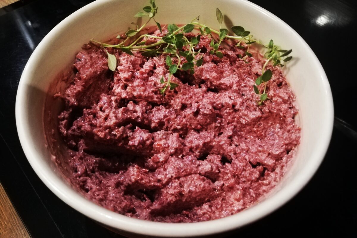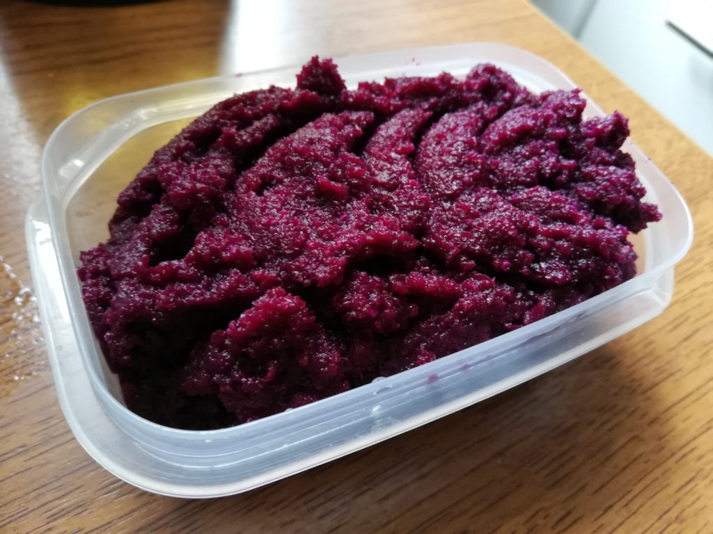 - Kiszone buraki (bez soku) przepuszczamy przez wyciskarkę wolnoobrotową, dodatkowy sok wypijamy :), resztki z kiszonych buraczków, przekładamy do miseczki, dodajemy majonez z orzechów nerkowca, w ilości takiej, jakiej odpowiada nam smak, ja dodaje tak około 3-4 łyżek, wszystko zależy od ilości buraczków.