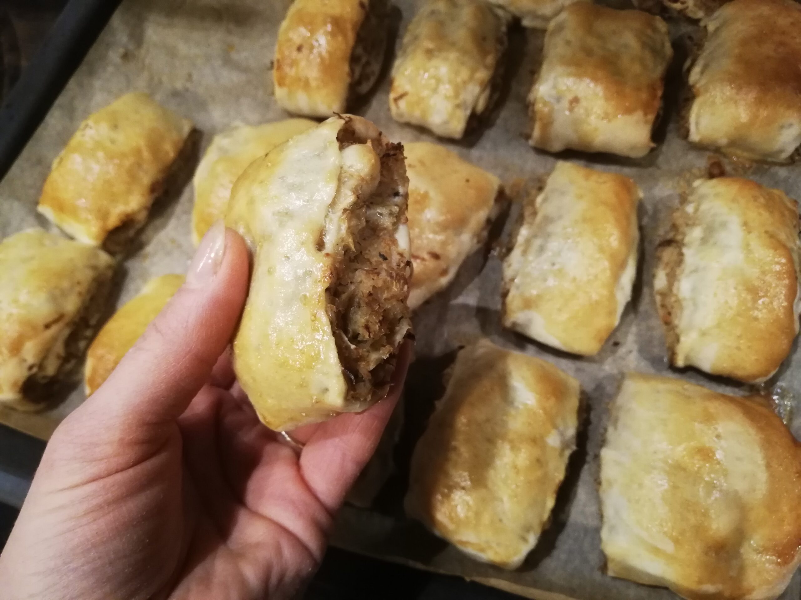 - Możemy też ciasto rozwałkować na grubość ok. 0,5 cm wyciąć małe prostokąty, nałożyć farsz i zwinąć jak roladki. Oczywiście Możemy też robić małe poduszeczki lub bułeczki.