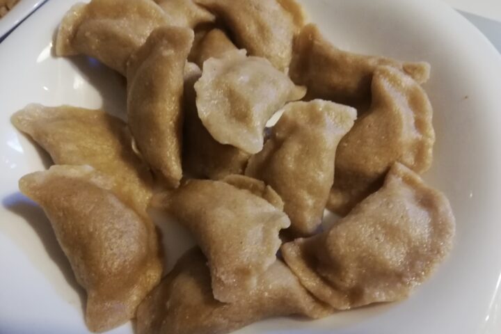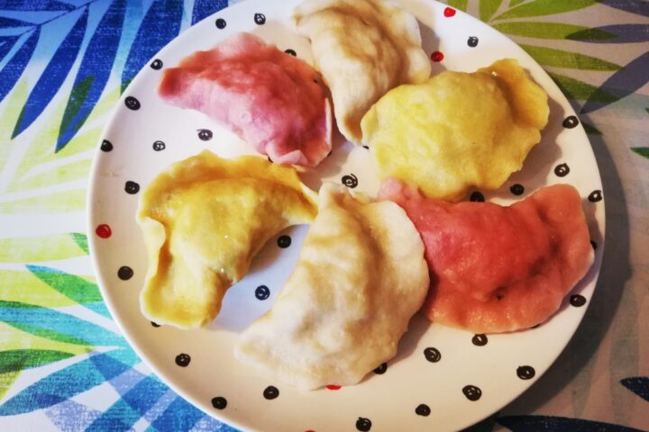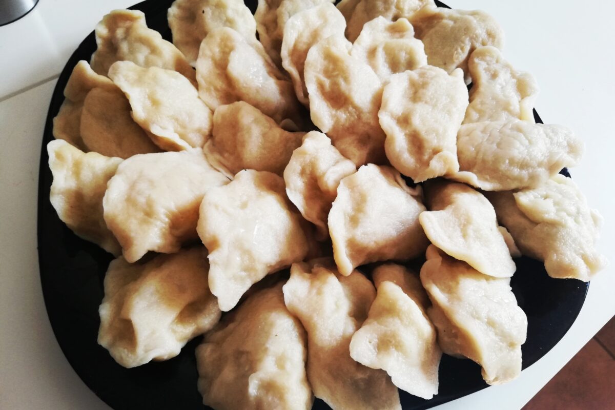 - Ciasto wyjąć, rozwałkować, wykroić kółka na pierogi, nakładać farsz i zlepiać.