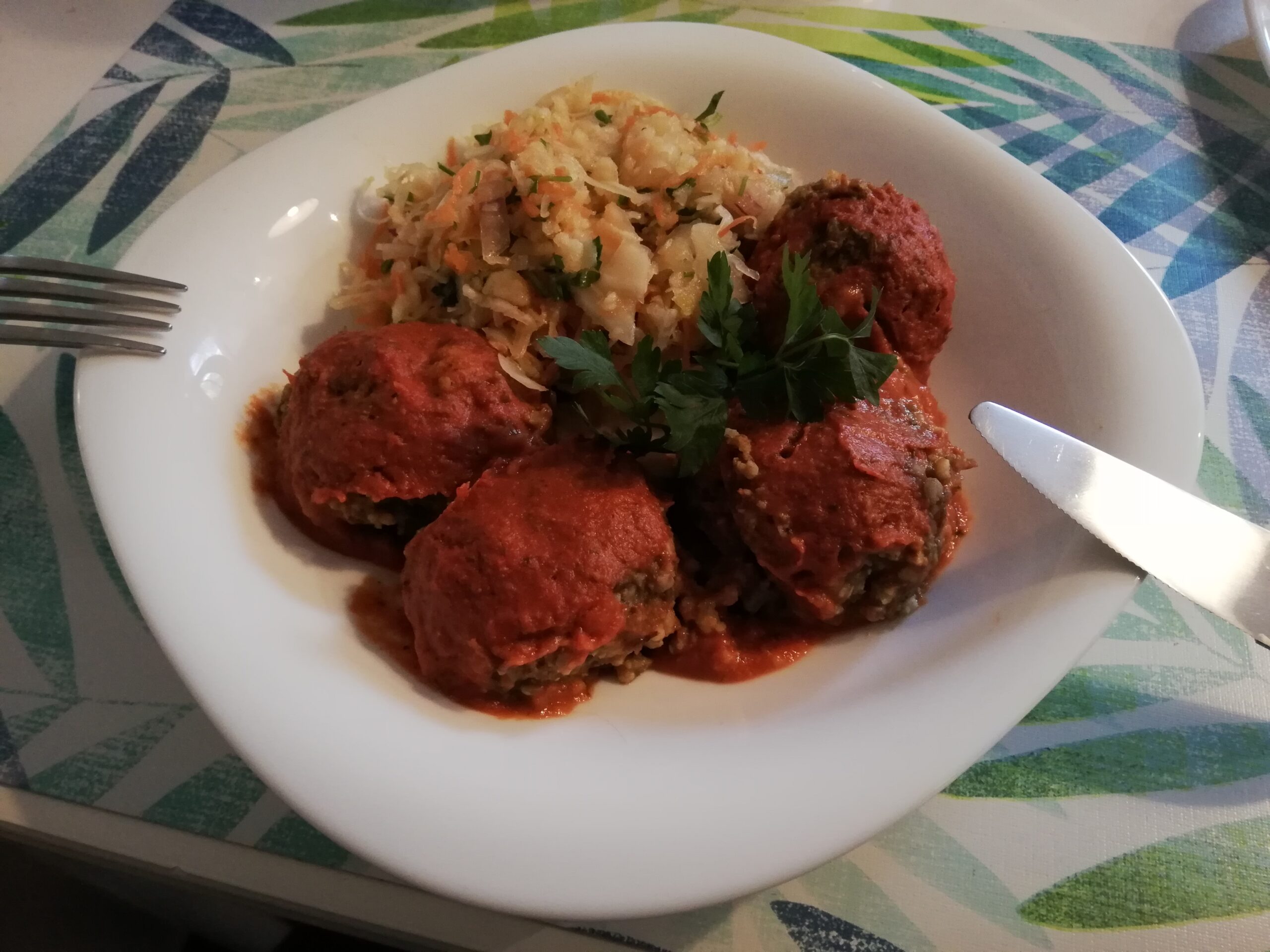 - Z masy formujemy pulpety, które układamy w brytfance i zapiekamy w w piekarniku w 180 C przez około 15- 20 min. Po tym czasie Pulpety polewamy sosem pomidorowym i zapiekamy około 10 minut.