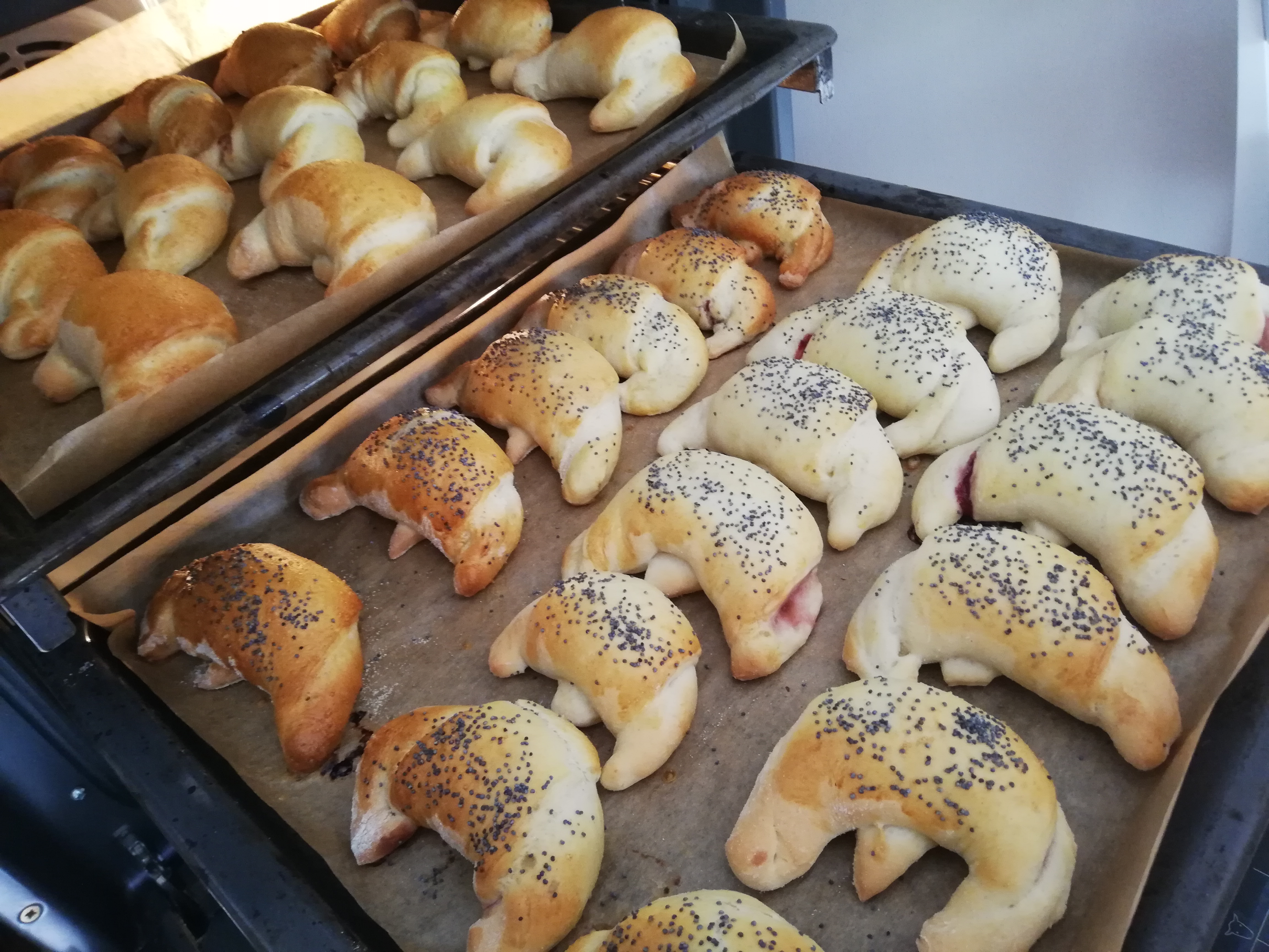 - Gdy rogale są już wyrośnięte, smarujemy rozmąconym jajkiem, posypujemy makiem, sezamem lub pozostawiamy gładkie.