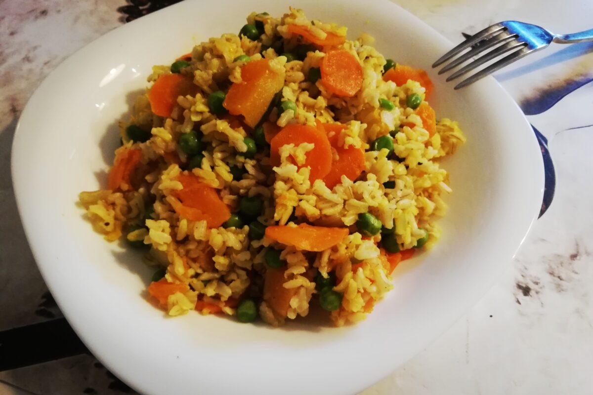 • Do gotowych warzyw wsypujemy groszek, mieszamy z minutę, dodajemy ryż mieszamy, dosmaczamy solą i pieprzem, zakrywamy na 10 minut, aby smaki się połączyły.
