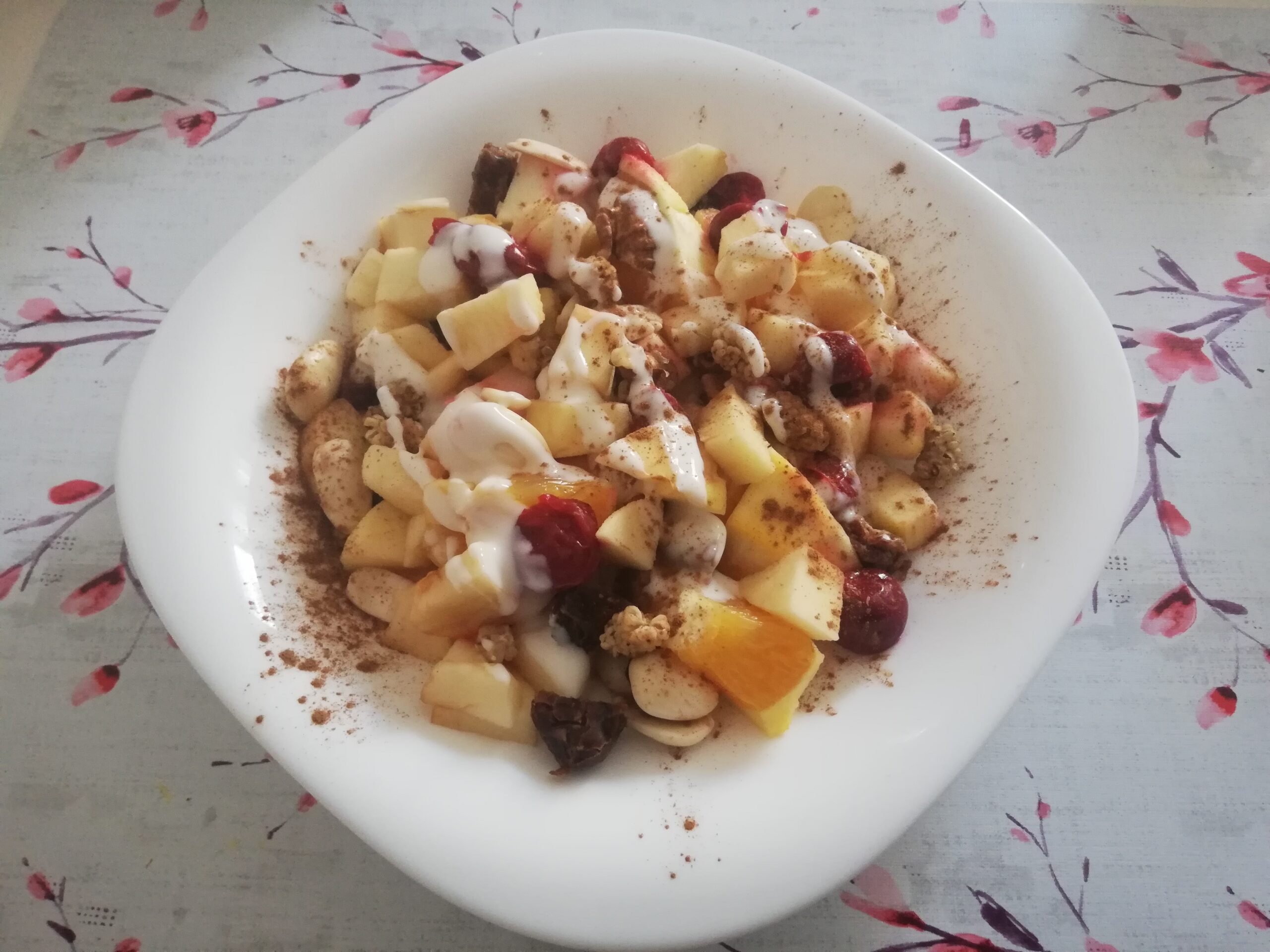 Do głębokiego talerza układamy kolejno, pokrojoną w kostkę pomarańczę, jabłka, pokrojone daktyle, dodajemy migdały, orzechy, wiśnie, morwę, całość skrapiamy jogurtem, oprószamy cynamonem.