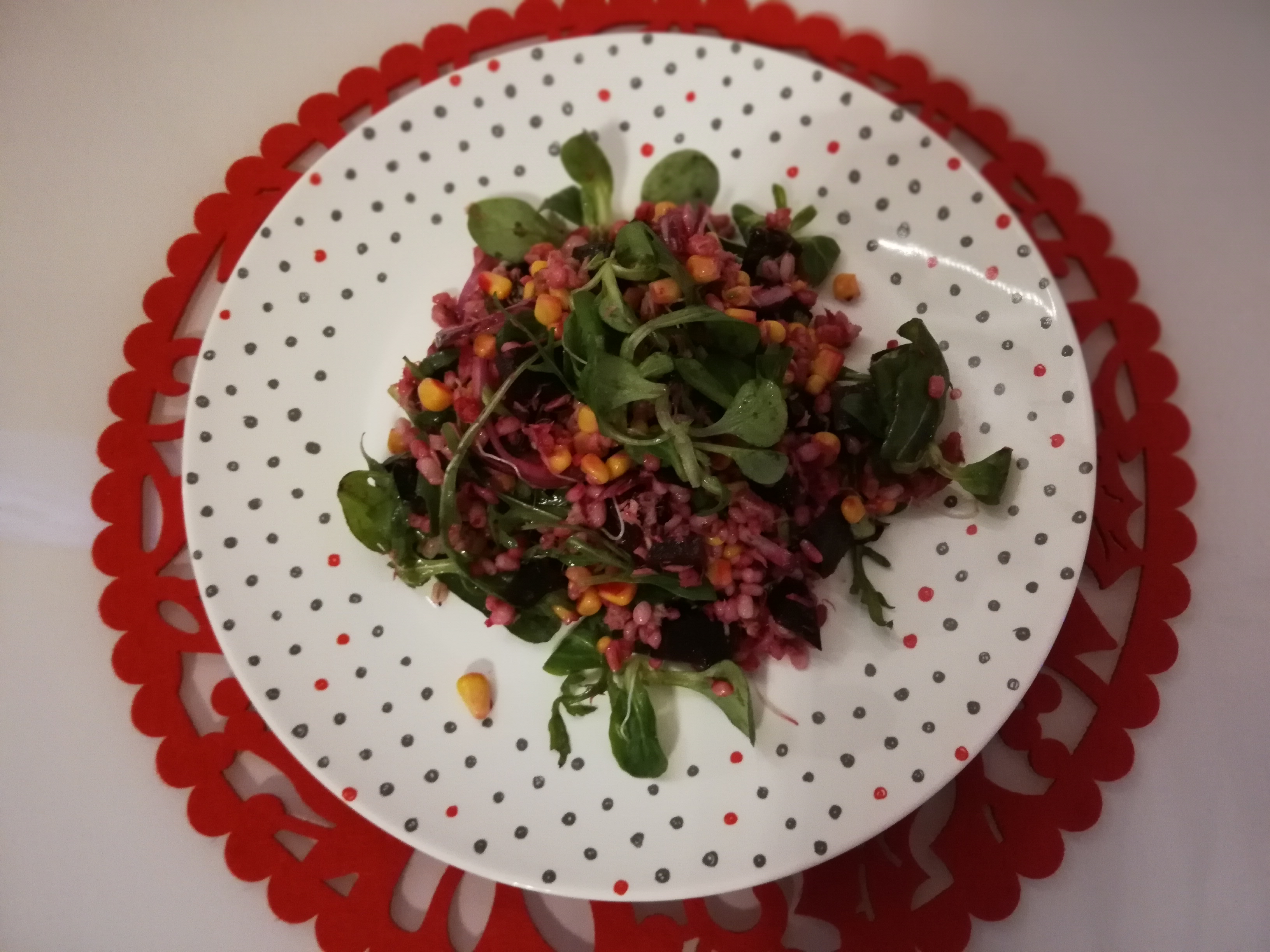 - Do szklanej miski wkładamy sałatę, rukolę i roszponkę, dodajemy kaszę, pokrojone grubą kostkę buraki, kiełki, cebulkę w piórka, odcedzoną kukurydzę, tuńczyka.