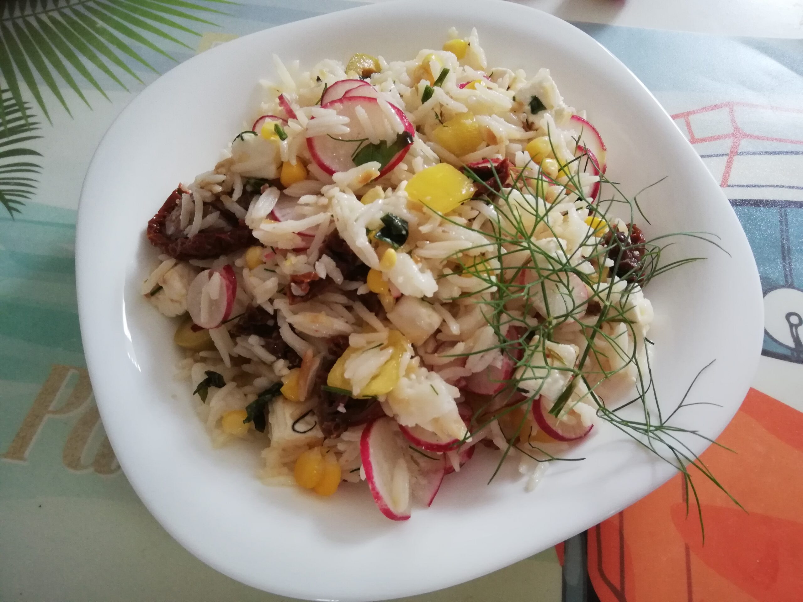 - Do ugotowanego, sypkiego ryżu dodajemy składniki, pokrojoną w kostkę paprykę, kukurydzę, rzodkiewki pokrojone w cienkie plastry, pokrojone suszone pomidory, posiekany koperek, ser kozi feta pokrojony w kostkę, przeciśnięty przez praskę czosnek, oliwę, mieszamy składniki , dosmaczamy solą i pieprzem.