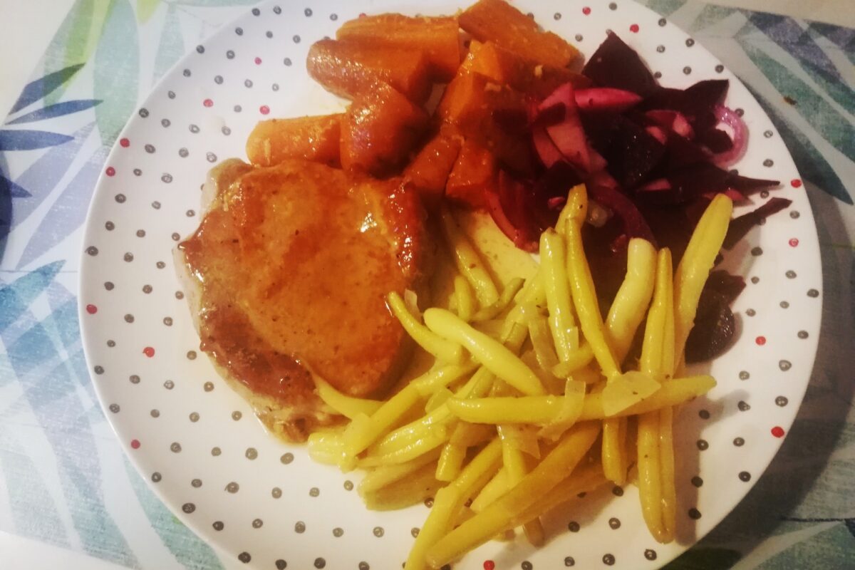 👉Wykładamy na talerz schab polany sosem, obok marchewka, fasolka i surówka z buraka…Smacznego!