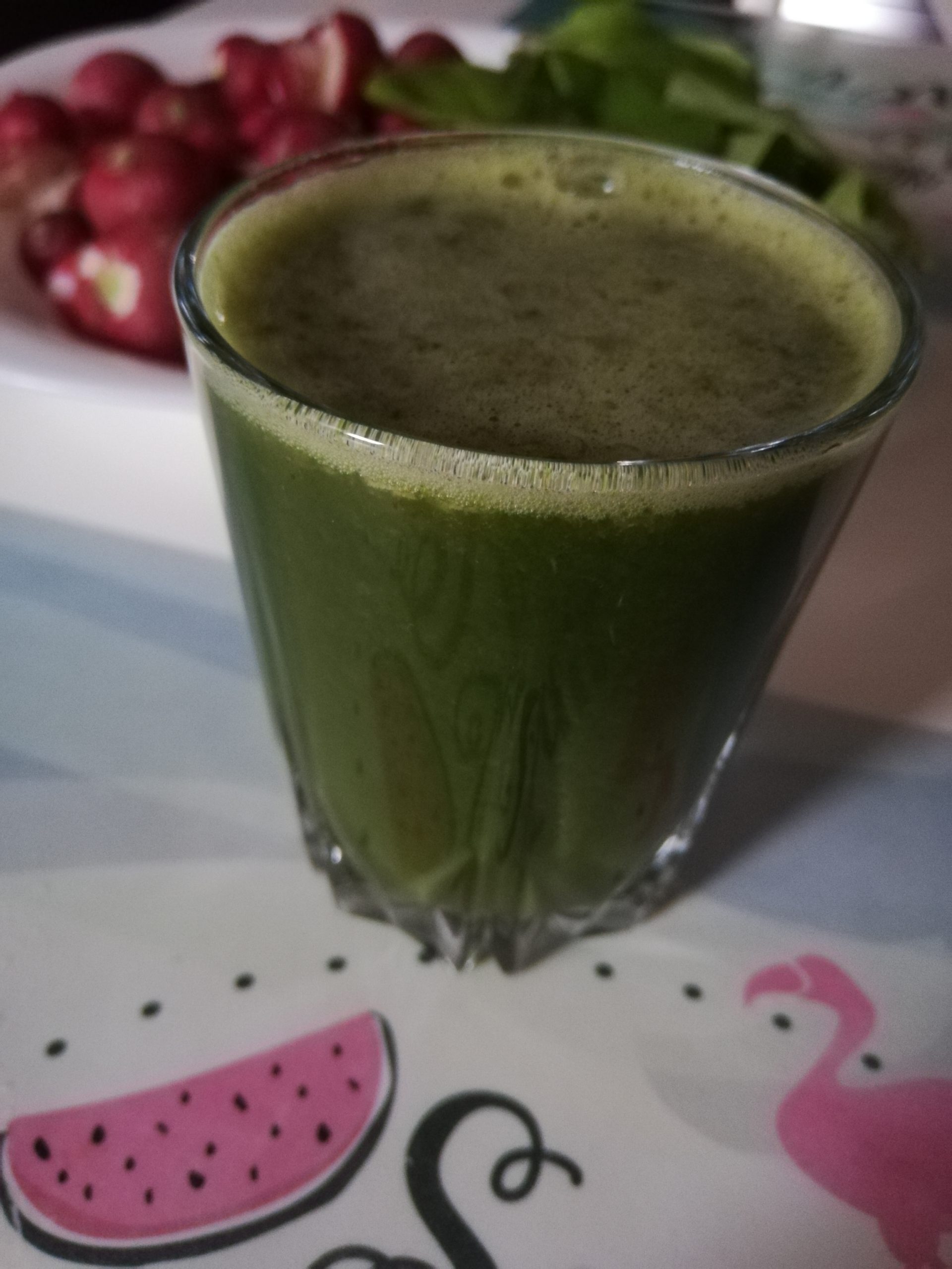 Świeży sok z bardzo wartościowych liści rzodkiewki. Oczywiście najlepiej z rzodkiewki z własnej uprawy (ekologicznej), co do sklepowej raczej nie byłabym pewna, że jest zdrowa, w każdym razie z takiej bym soku nie wypiła 🙂