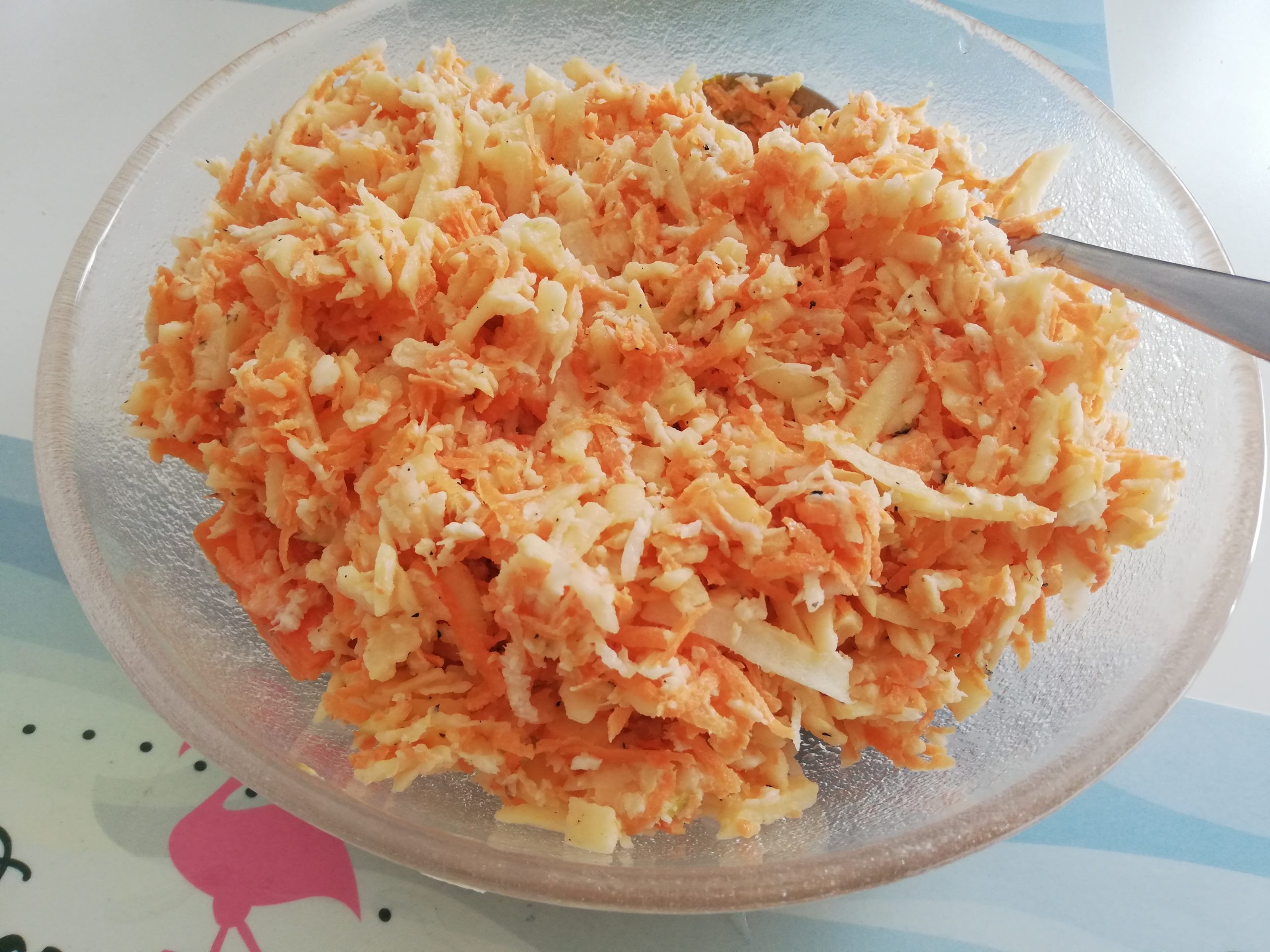 • Rzepę i marchewkę ścieramy na drobnej tarce, dodajemy starte na grubych oczkach jabłko, jogurt, sól i pieprz.