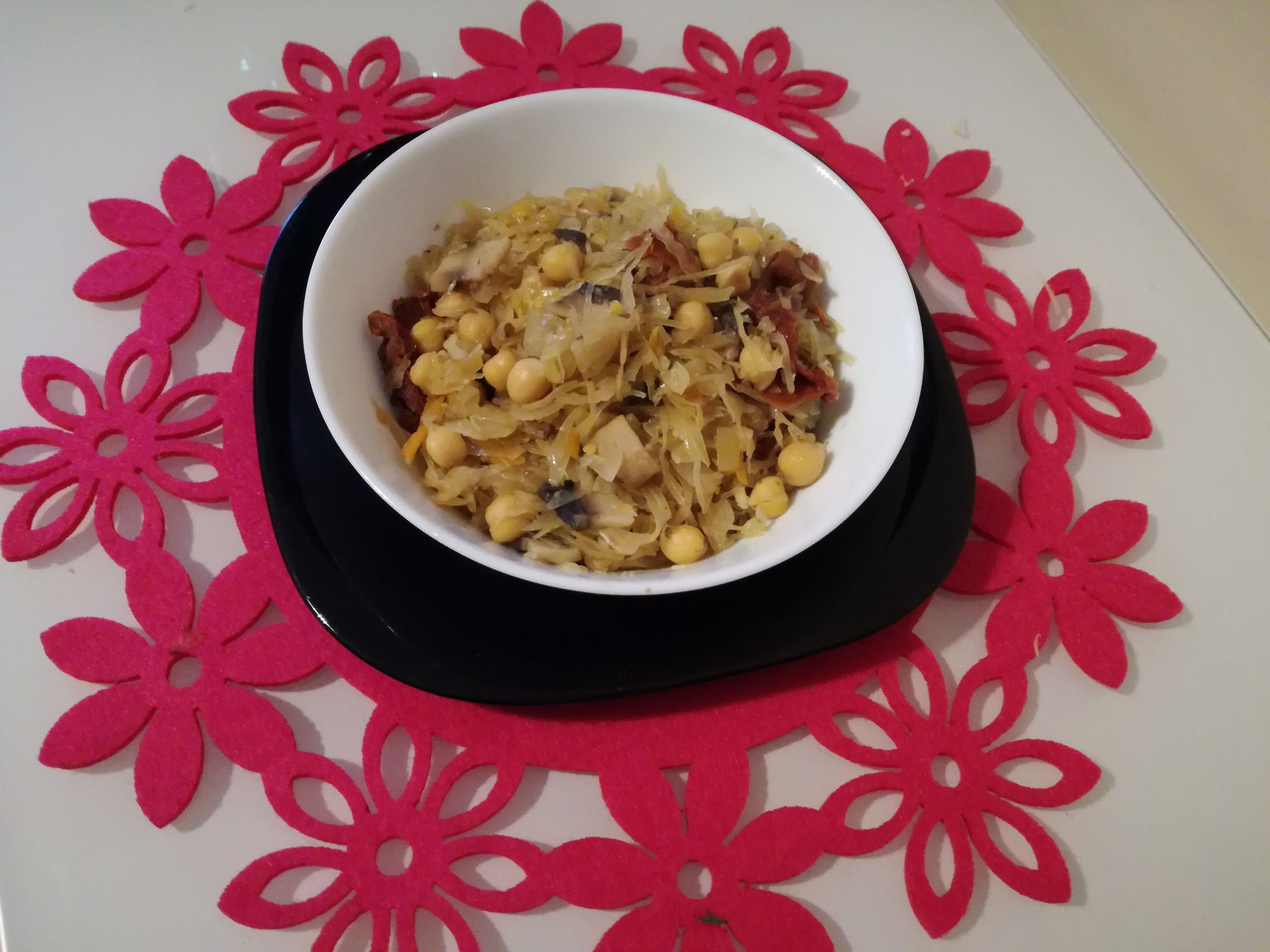 Kapusta kiszona z ciecierzycą i pieczarkami Potrzebujemy: 1 kg kapusty kiszonej lub mieszanka pół kapusty kiszonej i pół kapusty słodkiej. 1 szklanka ciecierzycy (namoczona dzień wcześniej i ugotowana, jak to zrobić? Zerknij tu). 7 pieczarek lub dwie garści suszonych grzybów (wcześniej ugotowanych) 1-2 cebule...