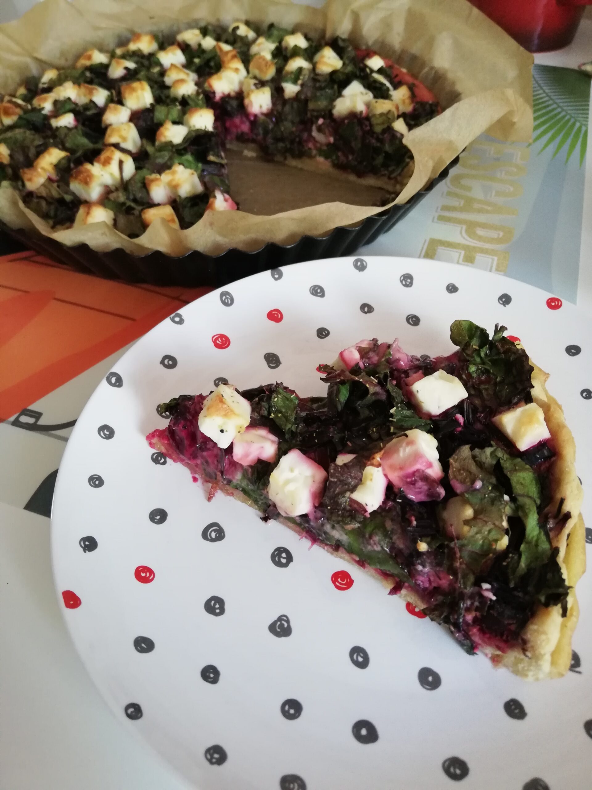 - Po tym czasie na zrumienione ciasto układamy bardzo dobrze umytą! Poszatkowaną botwinę, serek kozi.