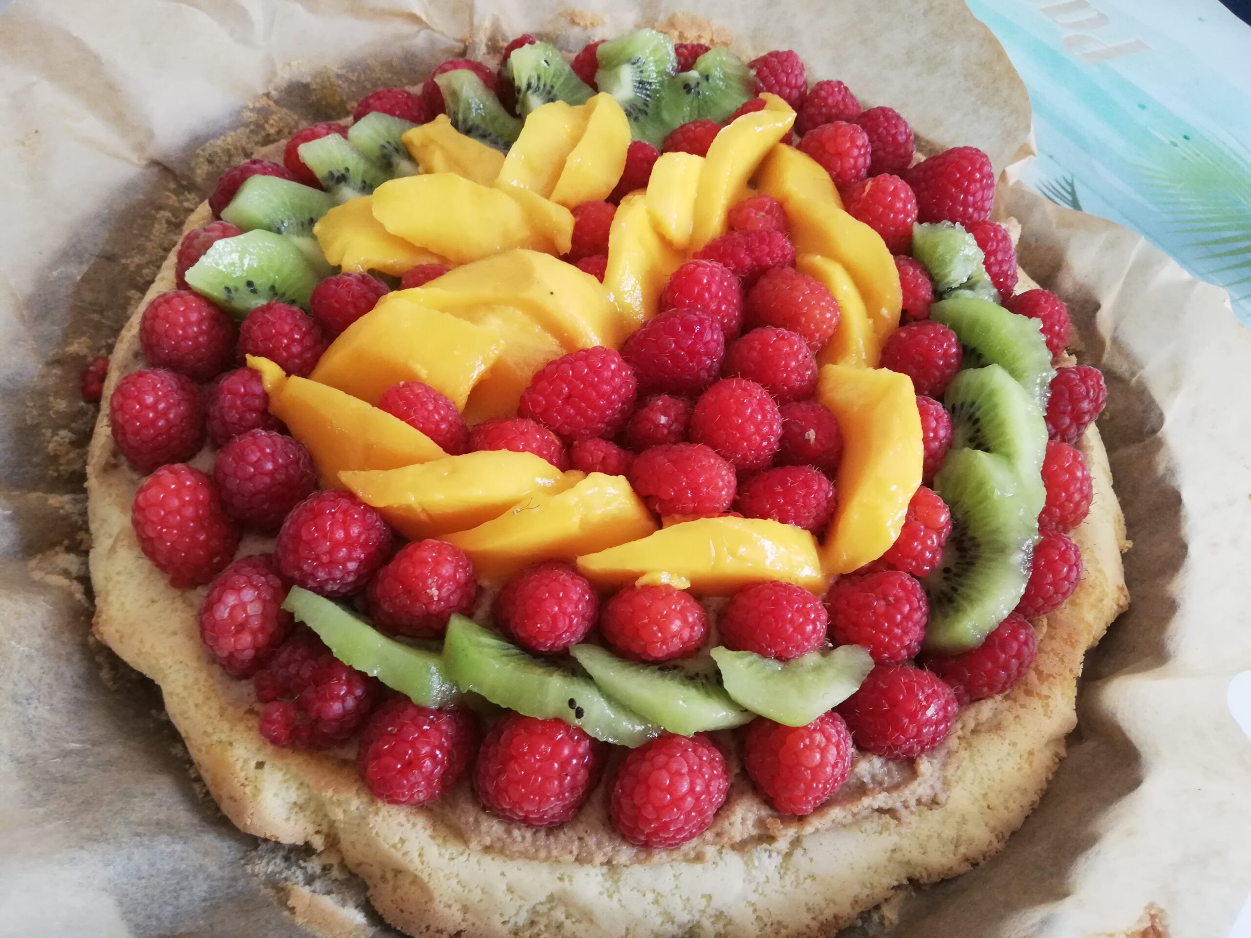 ❤️ Wierzch ciasta smarujemy kremem z orzechów nerkowca, na którym układamy wszystkie dowolne owoce tj. truskawki, poziomki, borówki, kiwi, mango, banany, maliny, jeżyny…