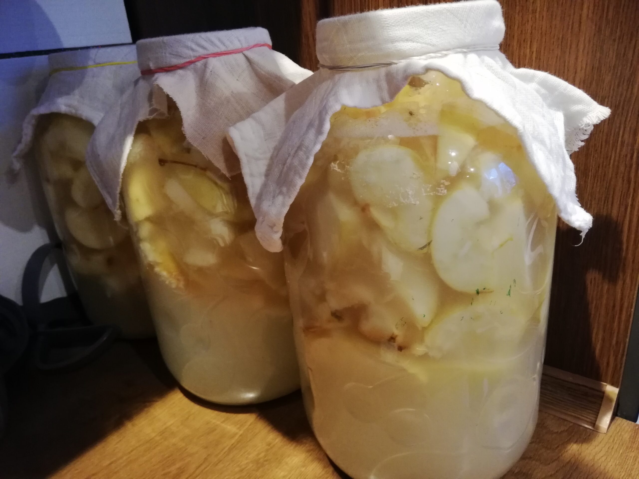 - Mieszamy, okrywamy gazą, zakładamy recepturkę bardzo dokładnie, aby nie dostała się żadna meszka, których może się namnożyć wokoło, skuszone zapachem fermentującego jabłka.