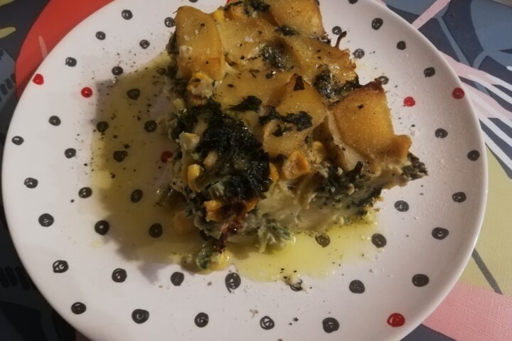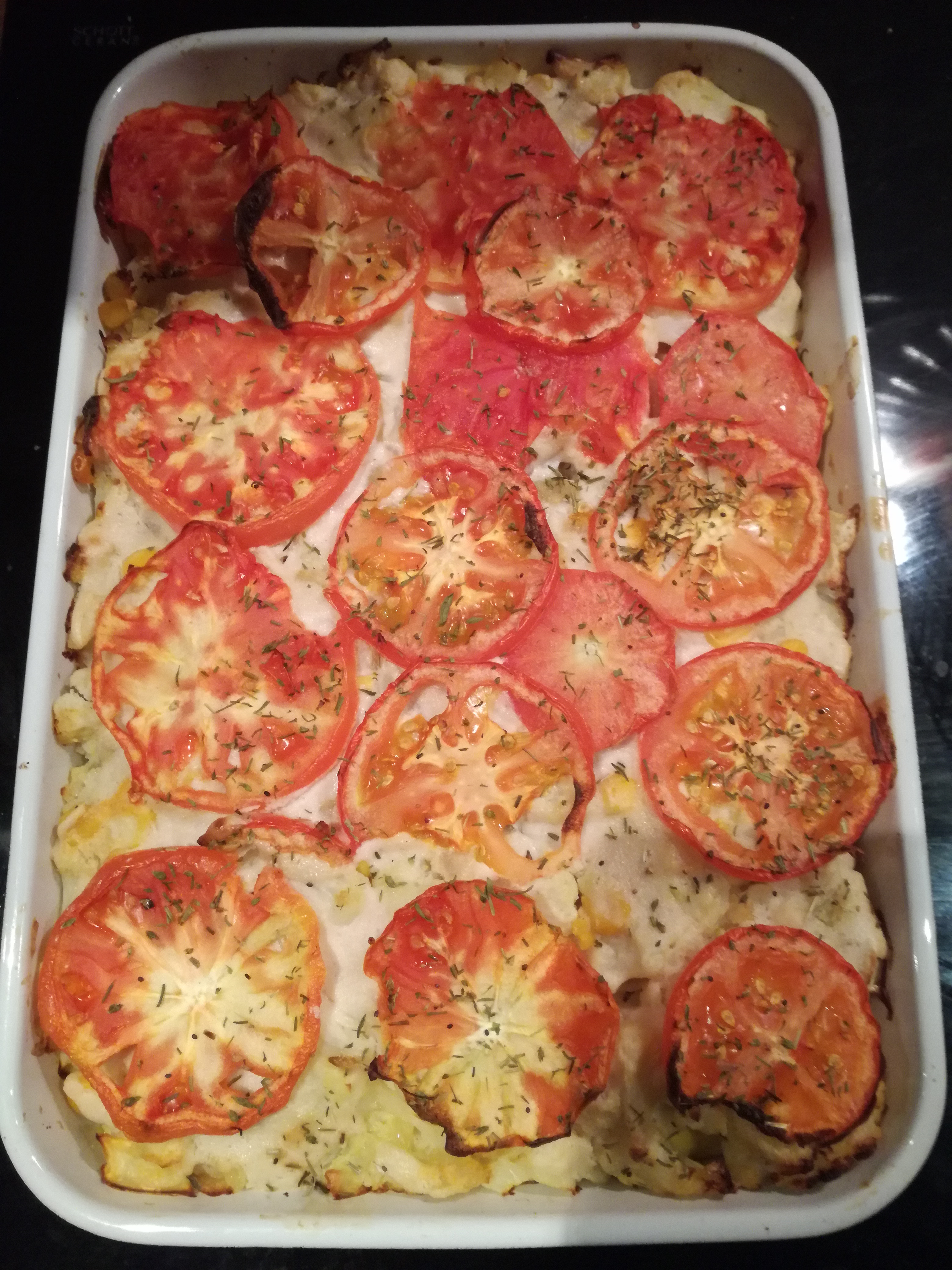 - Układamy w brytfance pokrojone w plastry ziemniaki, posypujemy cząbrem, do miski wbijamy jajka i roztrzepujemy trzepaczką, dodajemy rozdrabniamy drobno kalafior, kukurydzę, pokrojony drobno szczypior, sól, pieprz.