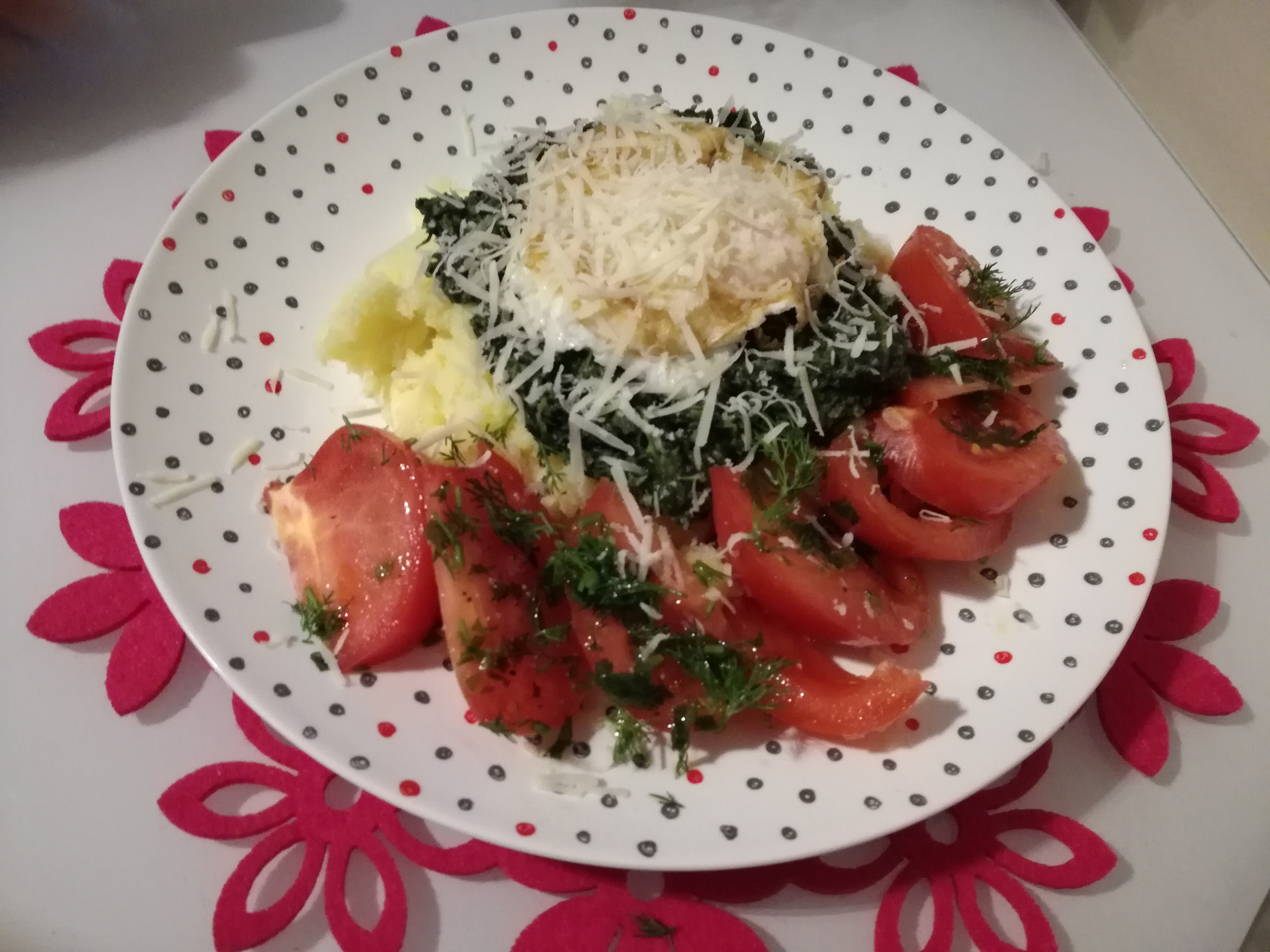 • Ziemniaki wykładamy na talerz, na ziemniaki kładziemy szpinak, na szpinak kładziemy jajko, posypujemy parmezanem. Podajemy ze świeżą sałatką z pomidora.