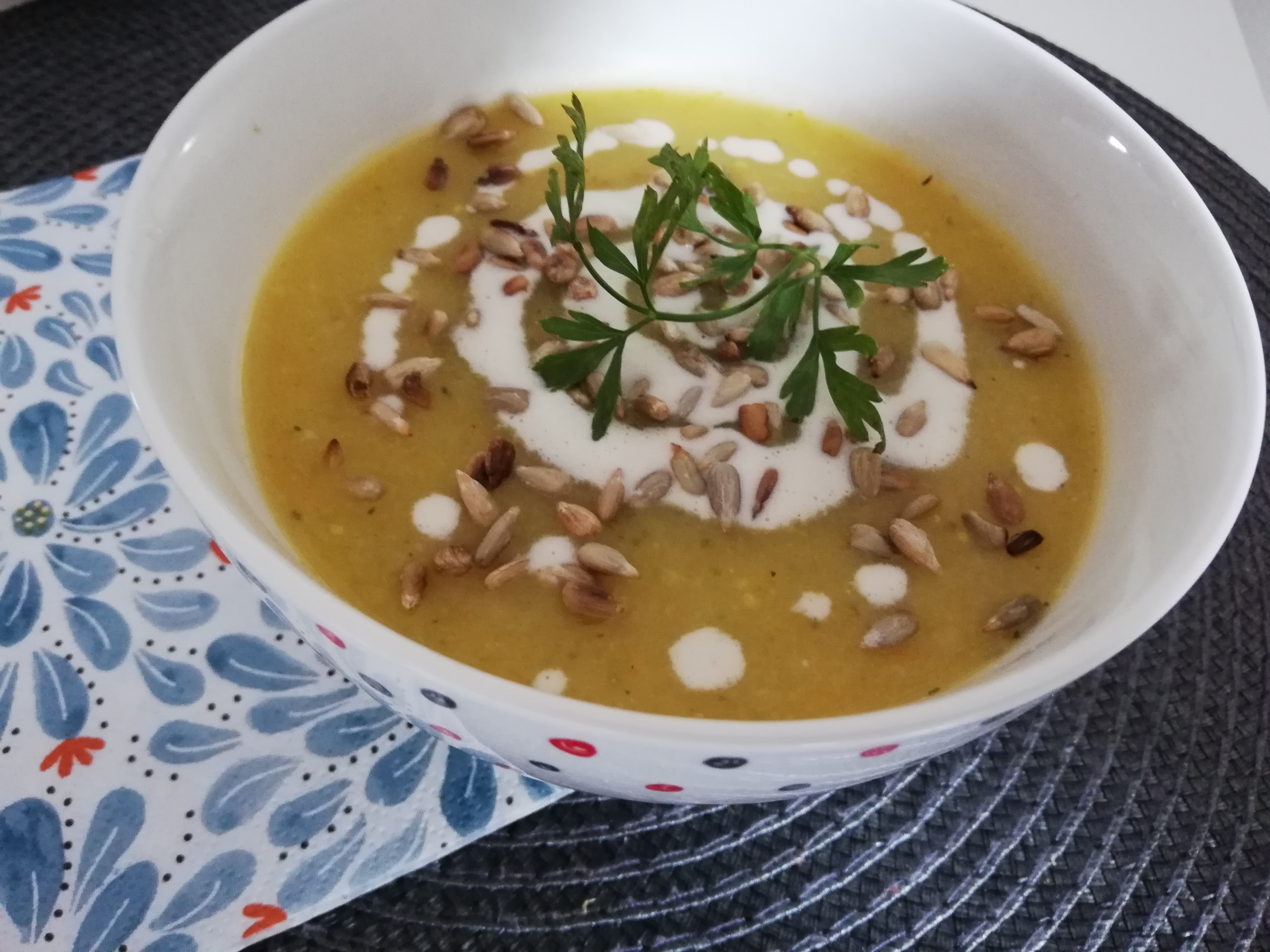 W garnku na tłuszczu podsmażam cebulkę na złoto, na tartce ścieram warzywa (marchew, pietruszkę), kroję cukinię i ziemniaki w kostkę, wrzucam wszystko do cebulki, dodaję lubczyk, czosnek, sól, chwilę podsmażam, zalewam wrzącą wodą tak, aby zakryła wszystkie warzywa, gotuję do miękkości. Wszystko razem dokładnie miksuję. Dosmaczamy solą, pieprzem i czosnkiem. Podaję ze śmietaną z nerkowców, posypaną prażonym słonecznikiem, dynią bądź czarnym sezamem.