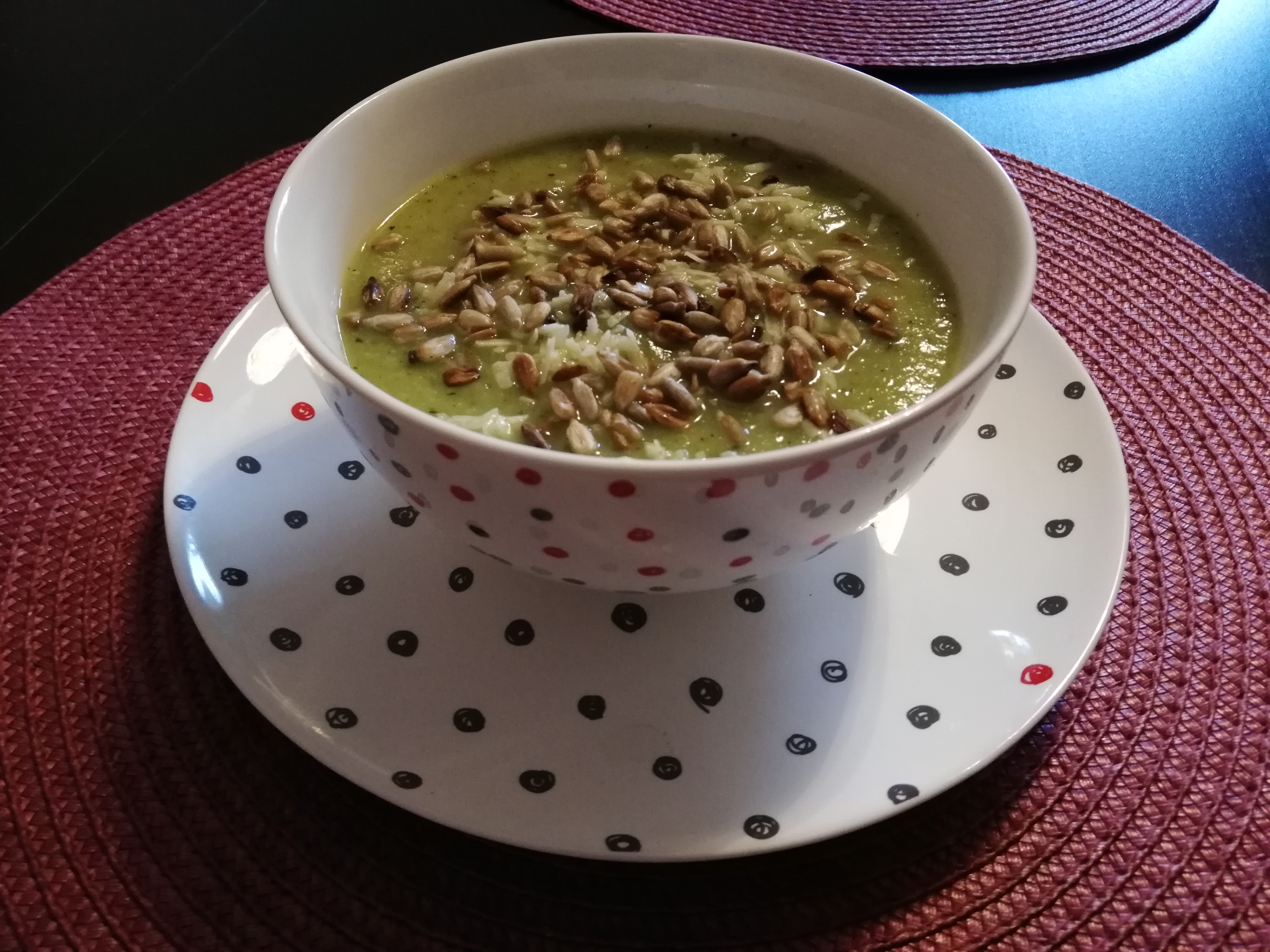 Pyszna i prosta zupka krem dla całej rodziny, ze smakowitej cukinii, podawana z serem kozim i prażonym słonecznikiem.