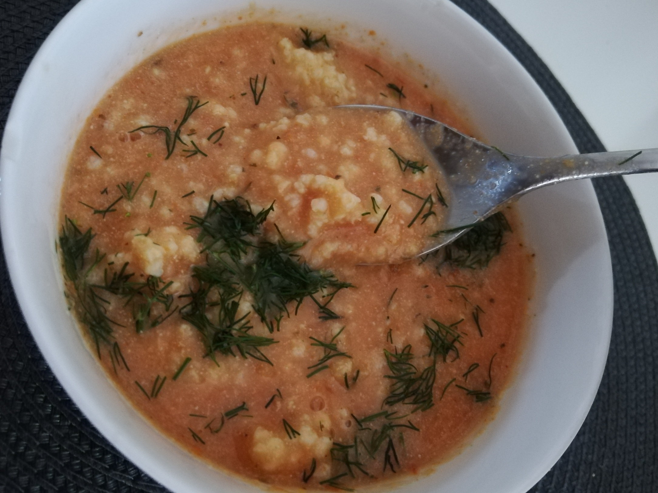 - Upieczone pomidory przekładamy do garnka, dodajemy 1 szklankę ugotowanej wody (ilość wody w zależności, jaką chcemy mieć konsystencje), dodajemy czosnek i dokładnie miksujemy. Do zmiksowanej zupki dodajemy śmietankę i wszystkie przyprawy tj. kardamon, cynamon, paprykę, sól i pieprz. Podajemy z kaszą jaglana i świeżym koperkiem.