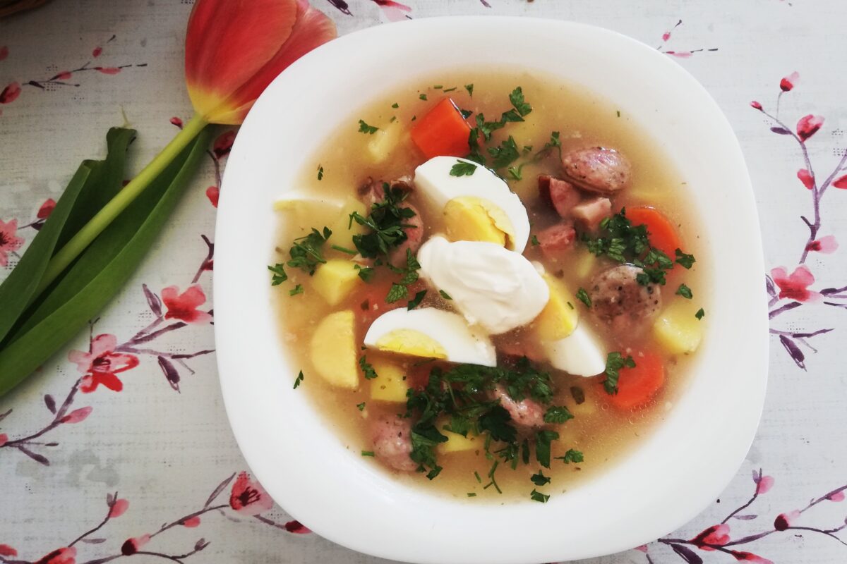 Żurek to jedna z pierwszych zup, które gościły na naszych stołach.. Pyszny rozgrzewający z bogactwem warzyw, jajek i kiełbasy. Mój żurek idealny, swój smak zawdzięcza przygotowanemu wcześniej zakwasowi. To on decyduje o smaku całej potrawy, dlatego warto zrobić go samodzielnie ( Przepis TU). Następnym bardzo ważnym składnikiem jest surowa biała kiełbasa, musi być świeża, bez jakichkolwiek konserwantów, z mięsa od zwierząt, gdzie nie podawane są hormony i antybiotyki.